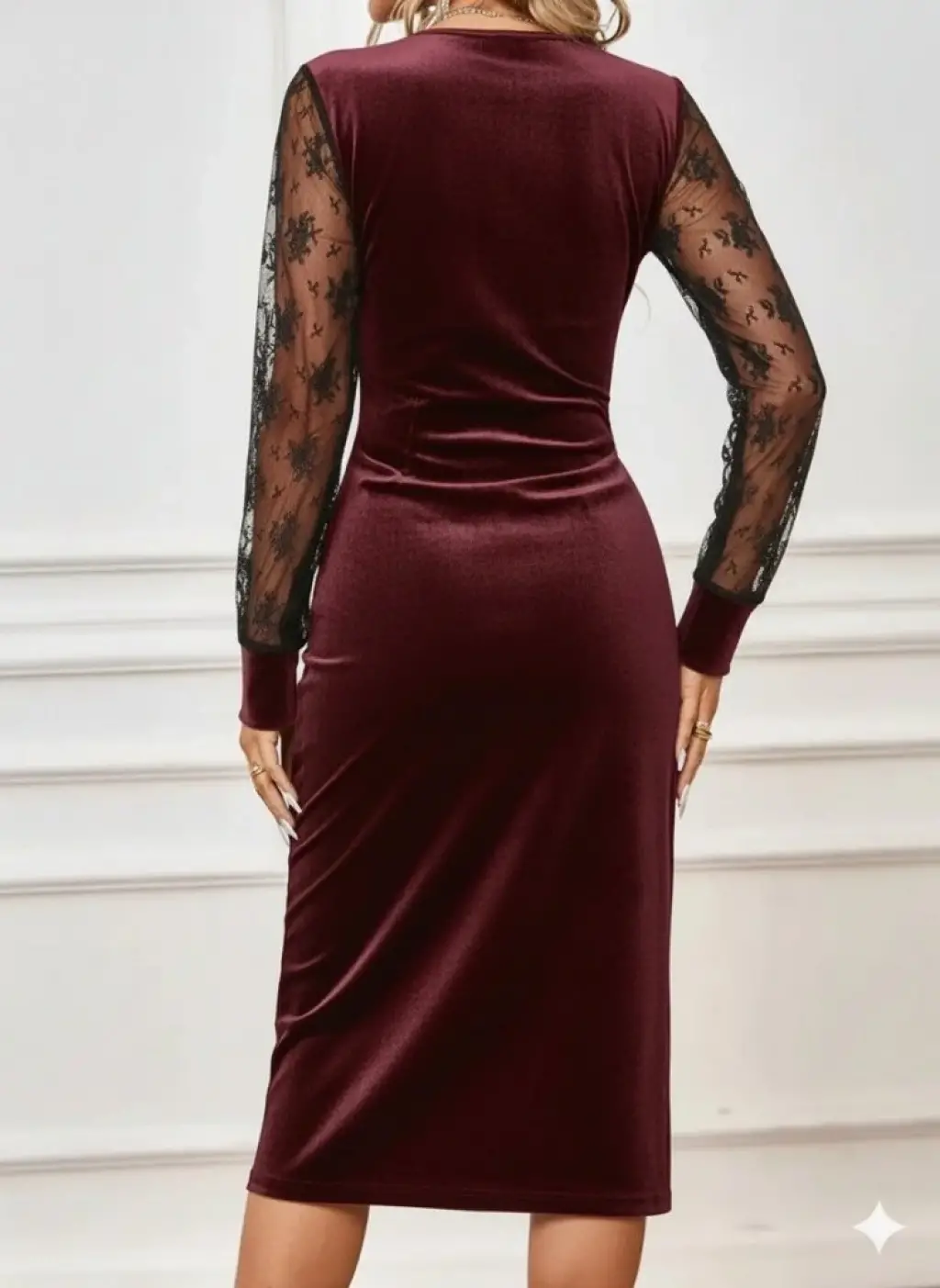 Kadın Uzun Kollu Kruvaze Yakalı Yandan Düğmeli önden çapraz Kesin Detaylı Midi Kadife Elbise
