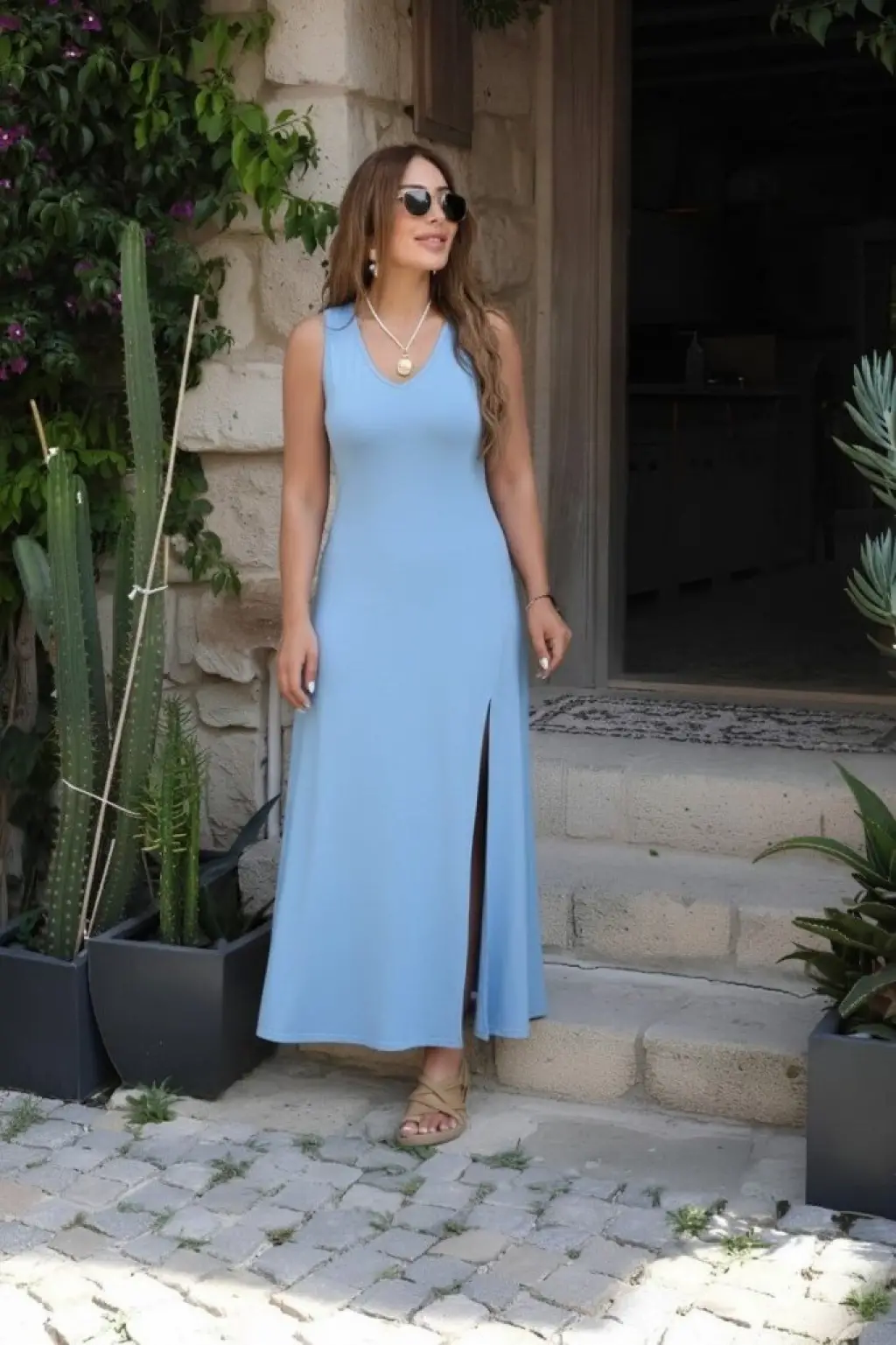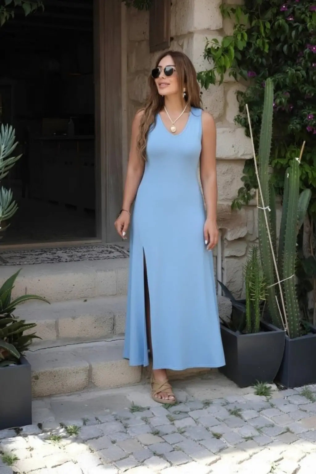 Kadın Askılı V Yakalı Yırtmaçlı Uzun Viskon Elbise