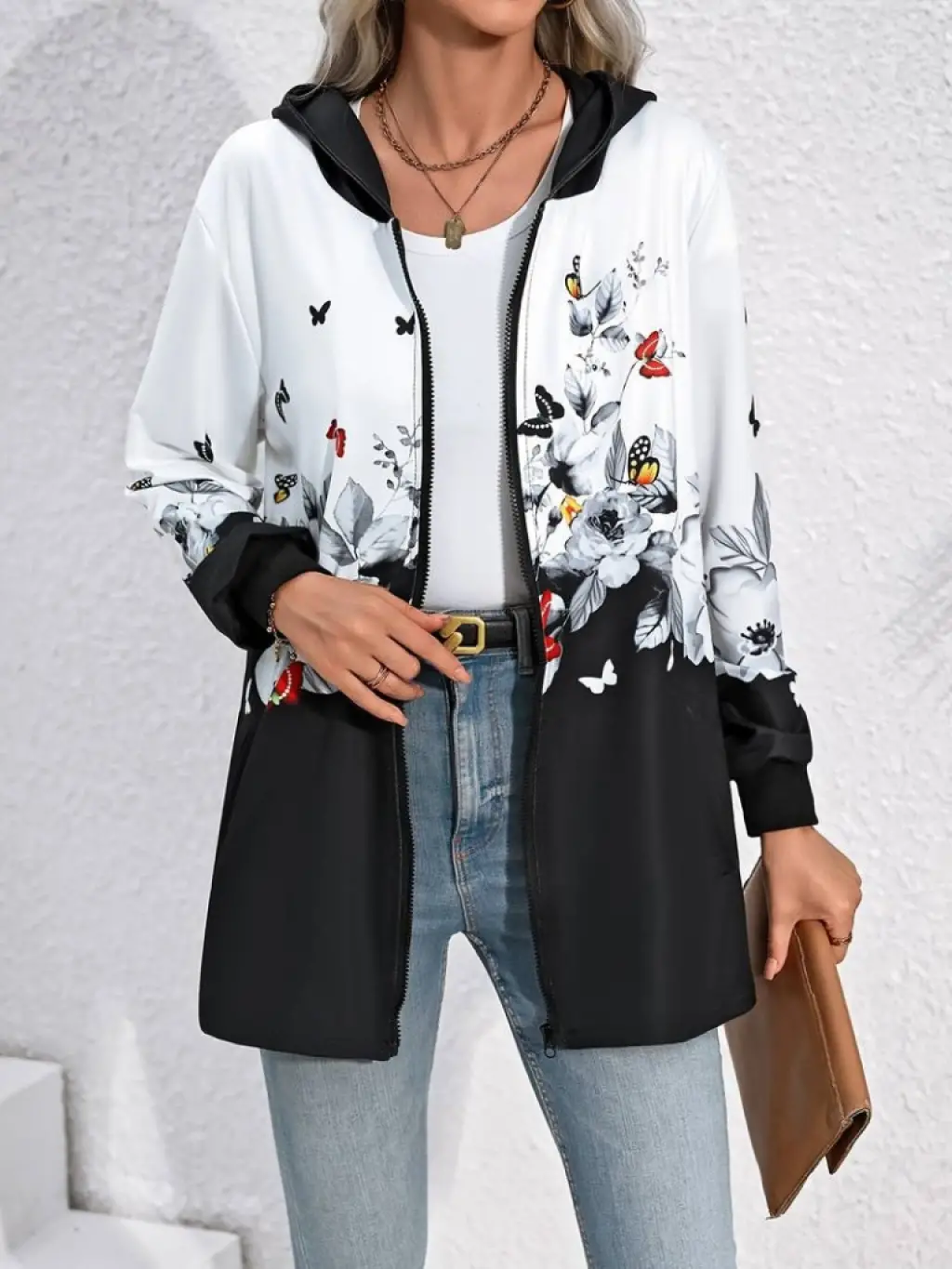 Kadın Uzun Kollu Kapşonlu Fermuarlı çiçek-kelebek Desenli şardonlu Dalgıç Ceket