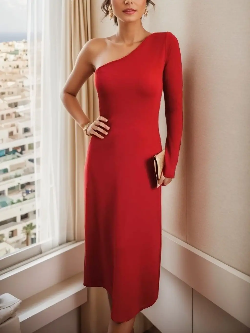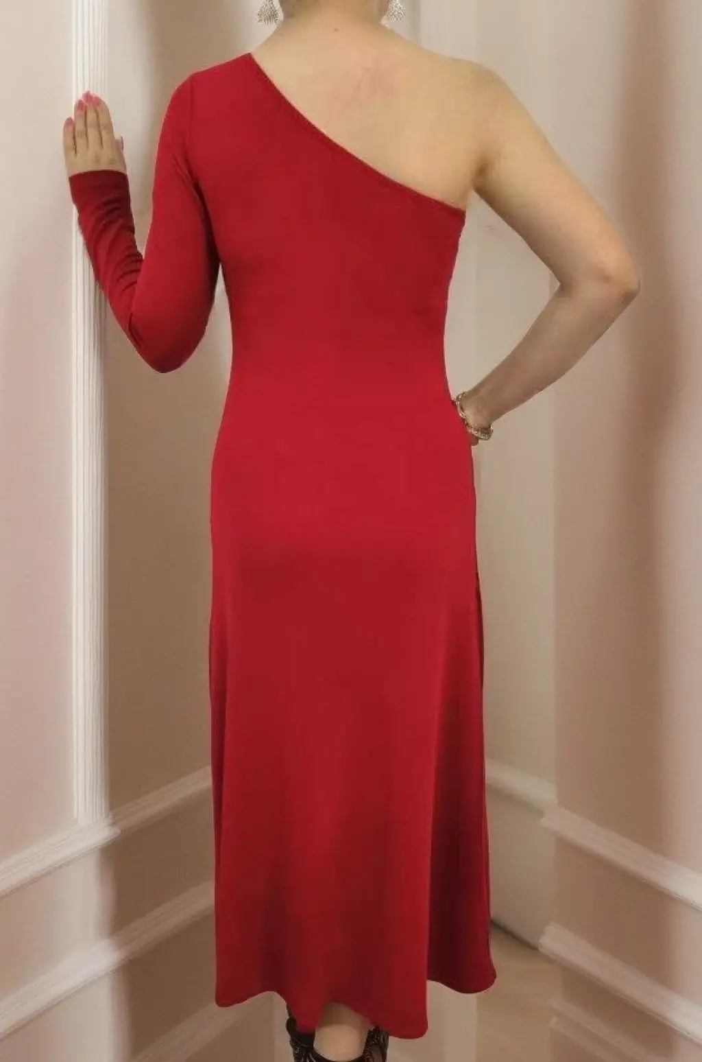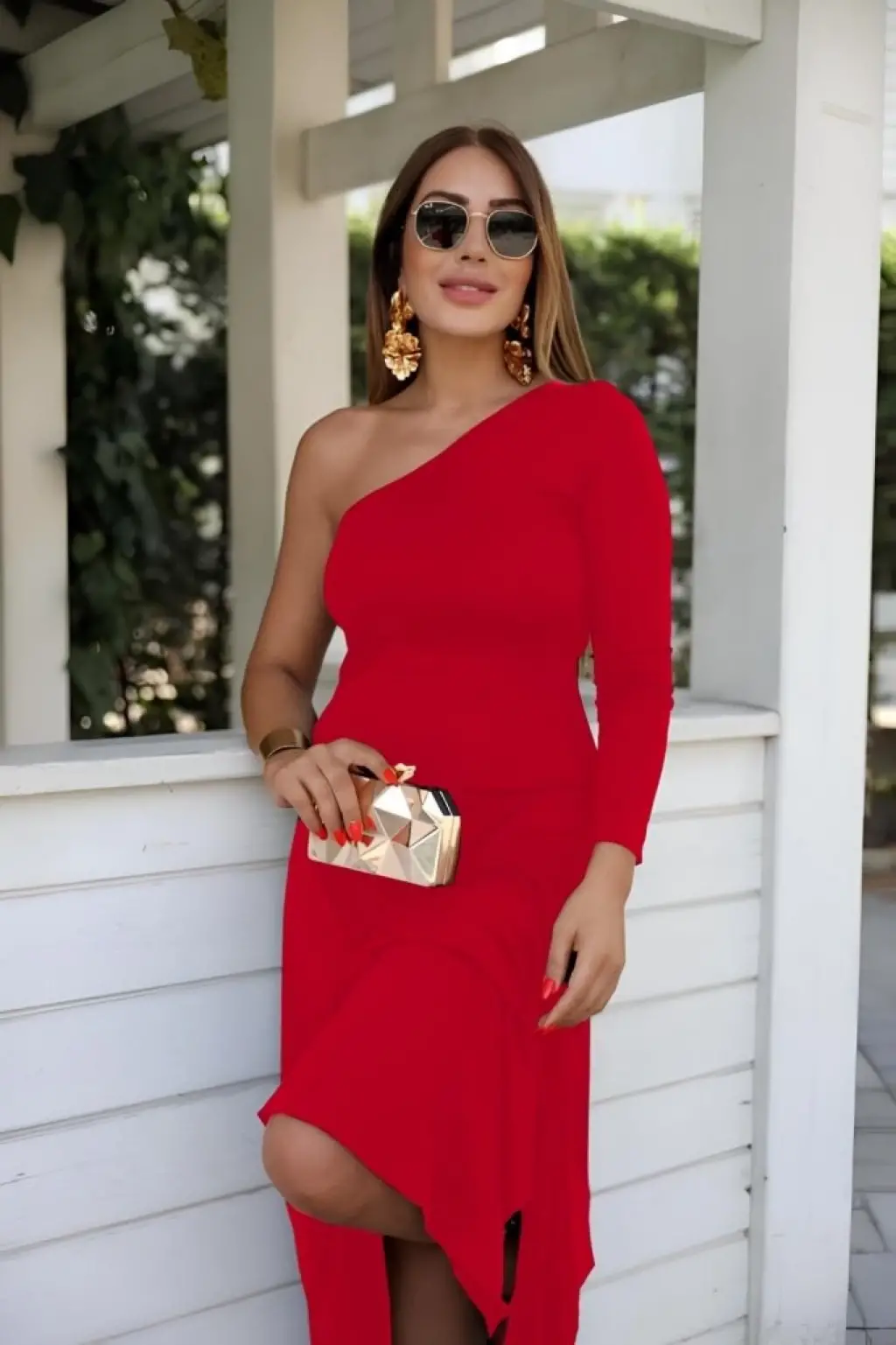Kadın Uzun Kollu Tek Omuz Detay Krep Elbise