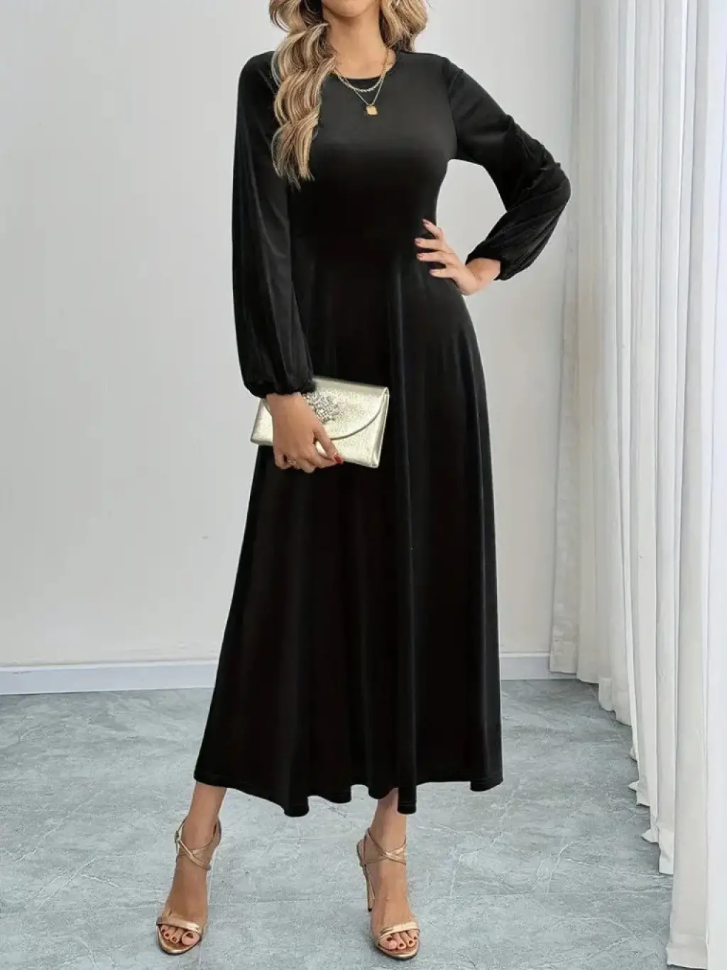 Kadın Uzun Kollu Bisiklet Yaka Midi Kadife Elbise