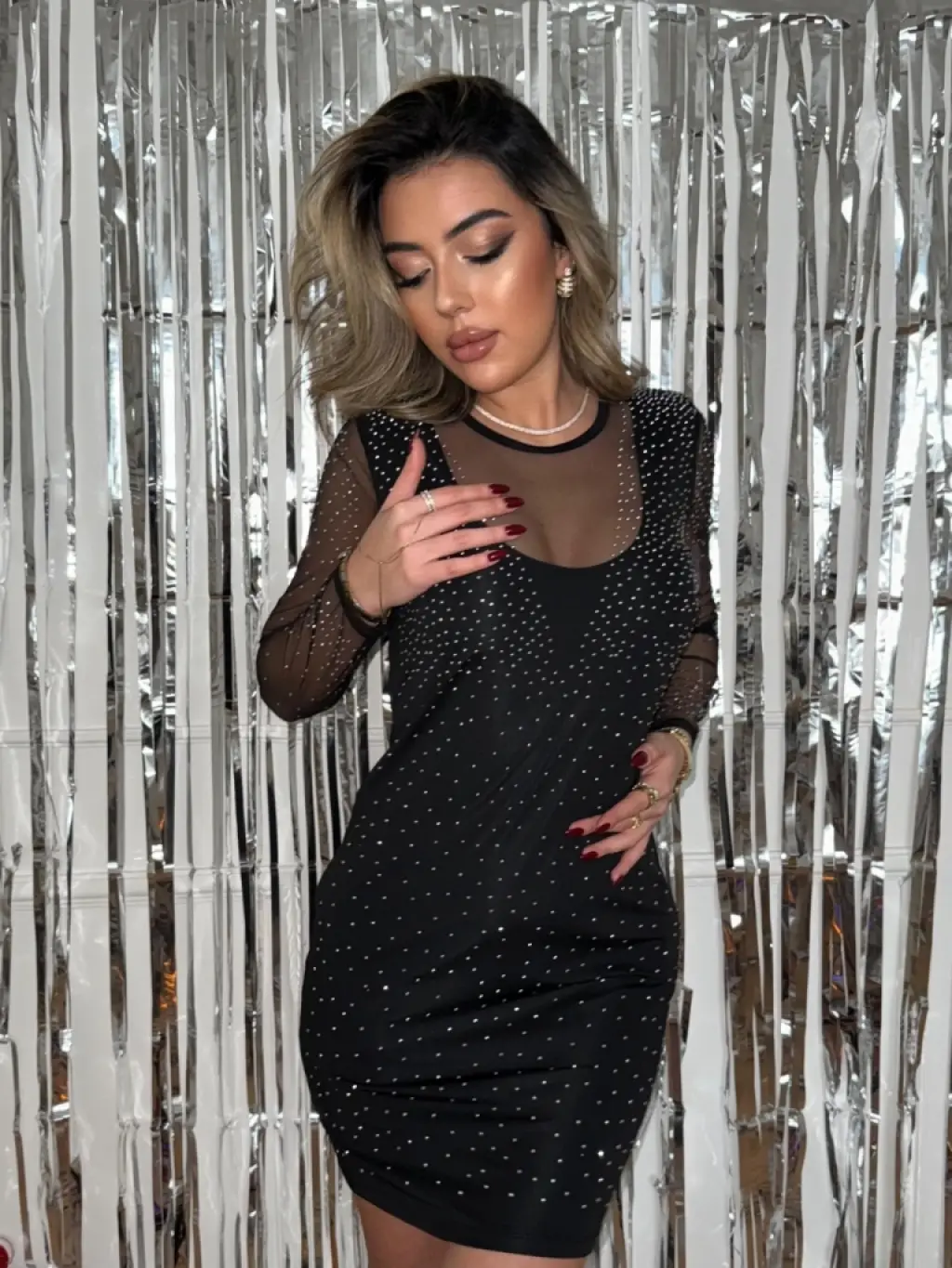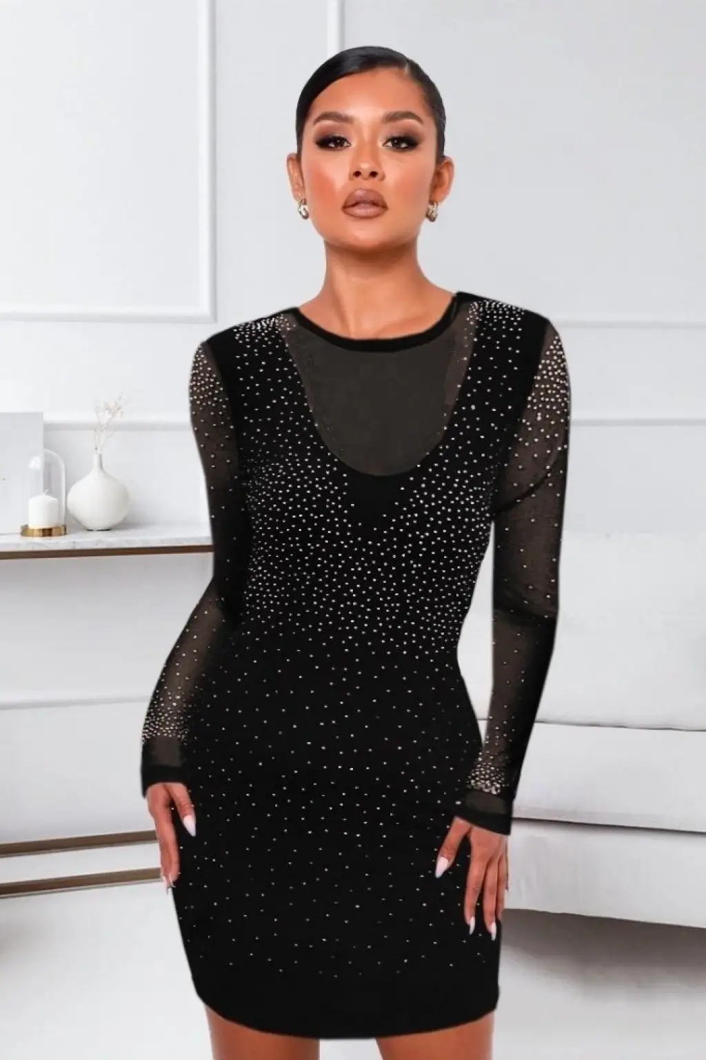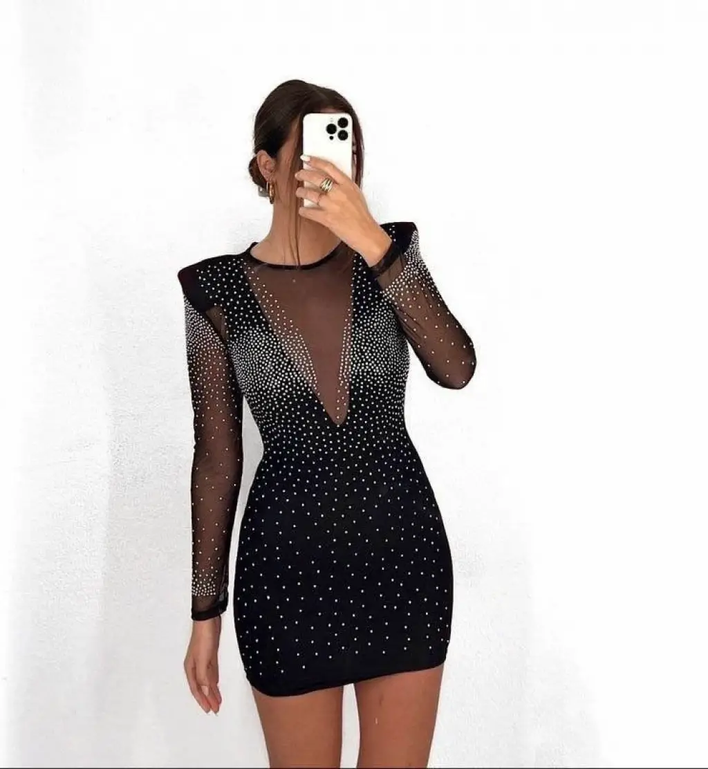 Kadın Uzun Kollu Yuvarlak Yaka Dekolteli Taşlı Dalgıç Elbise