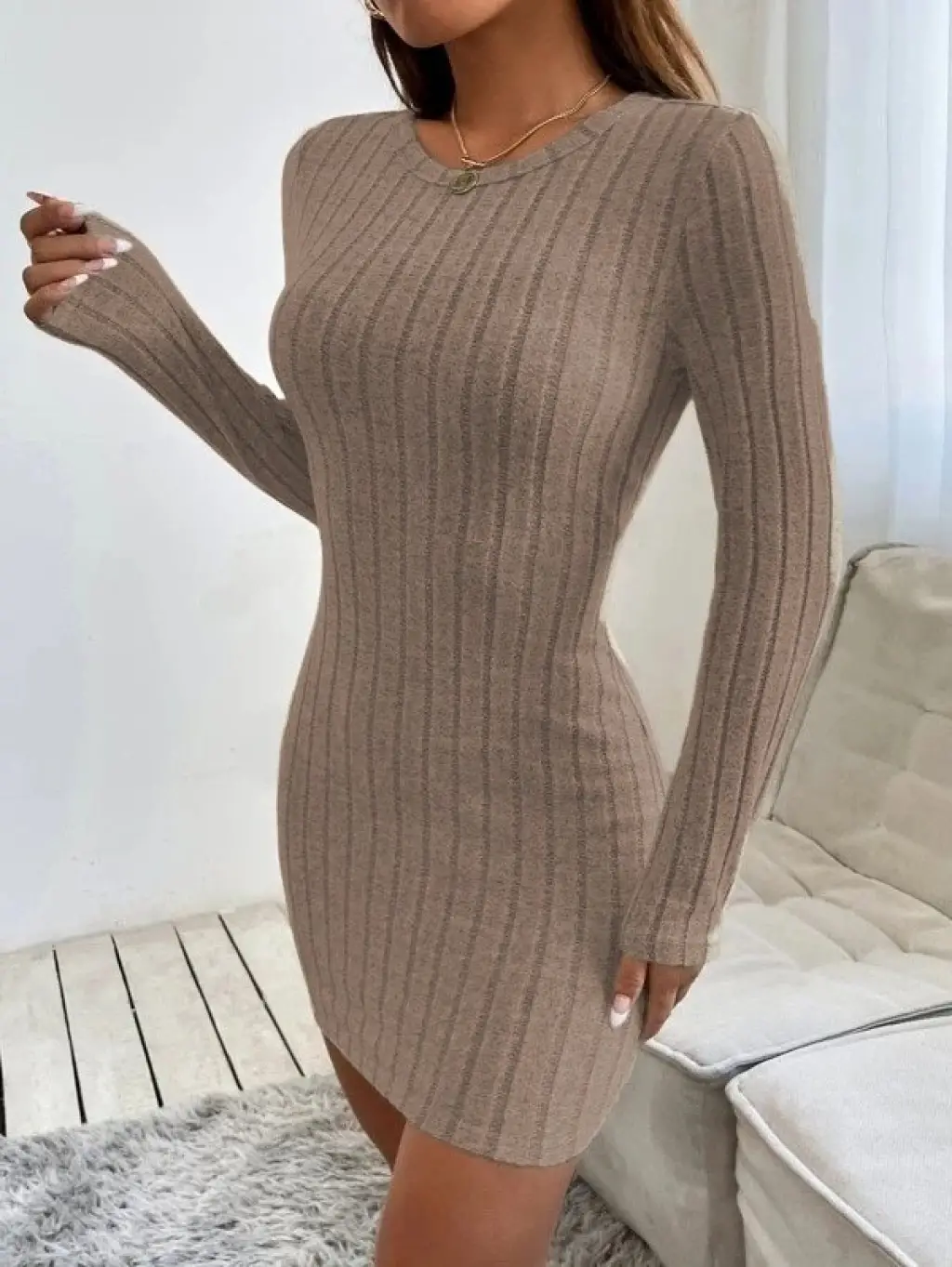 Kadın Uzun Kollu Bisiklet Yaka şardonlu Kalın Fitilli Kaşkorse Mini Boy Elbise