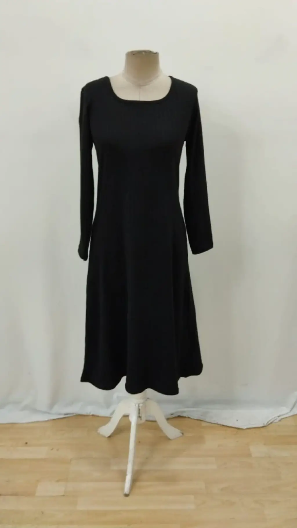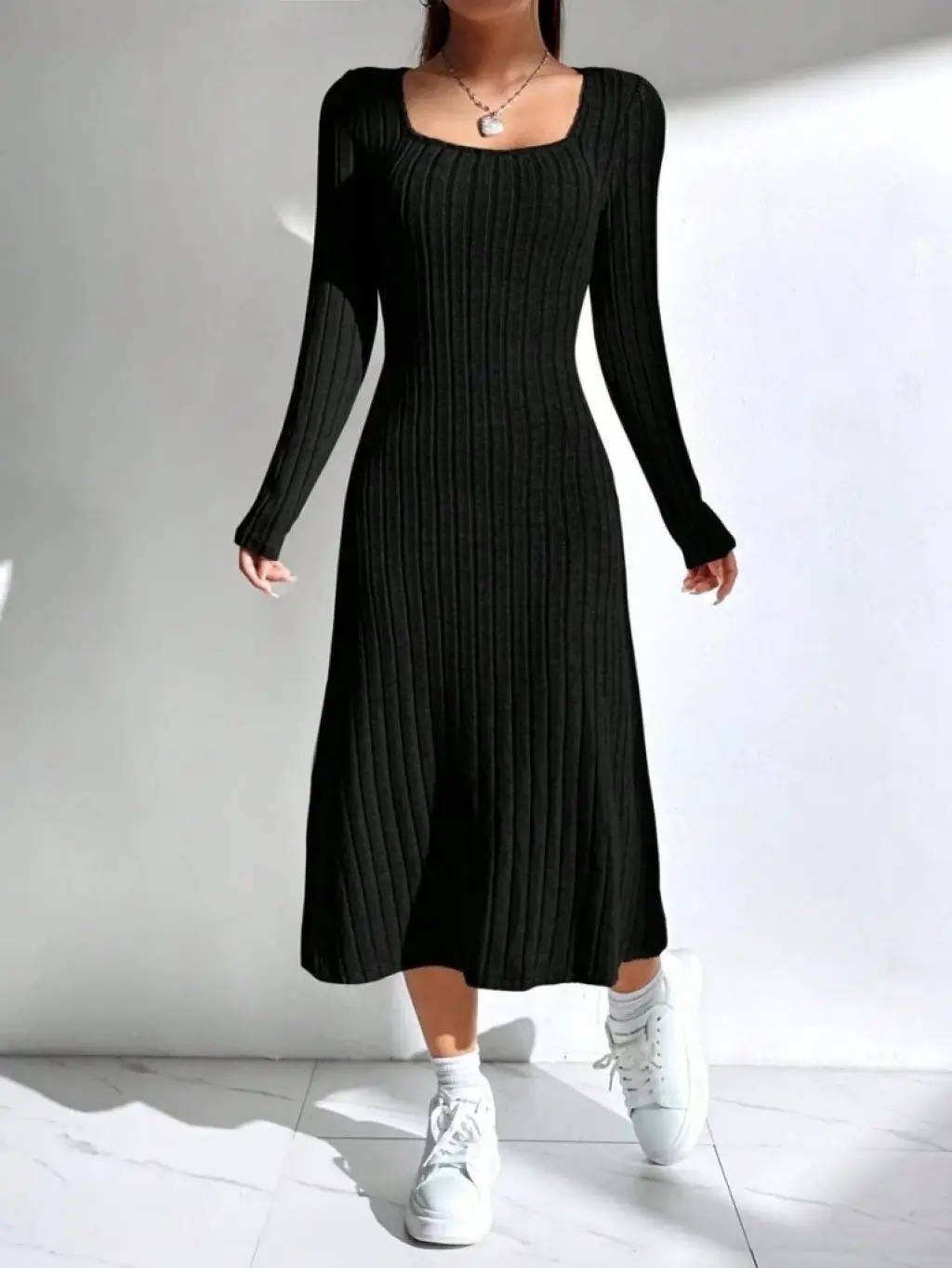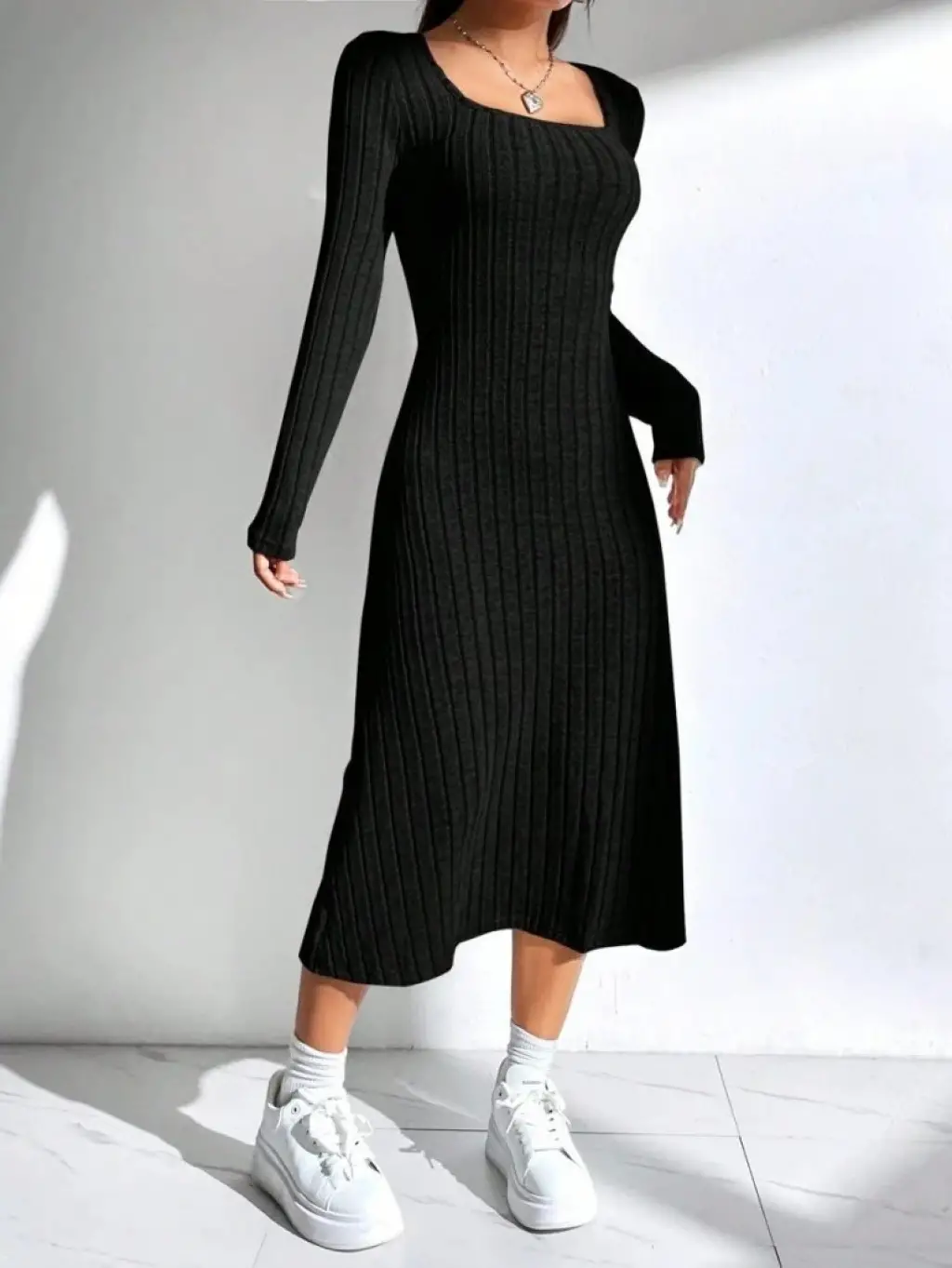 Kadın Uzun Kollu Kare Yaka Midi Kaşkorse Elbise