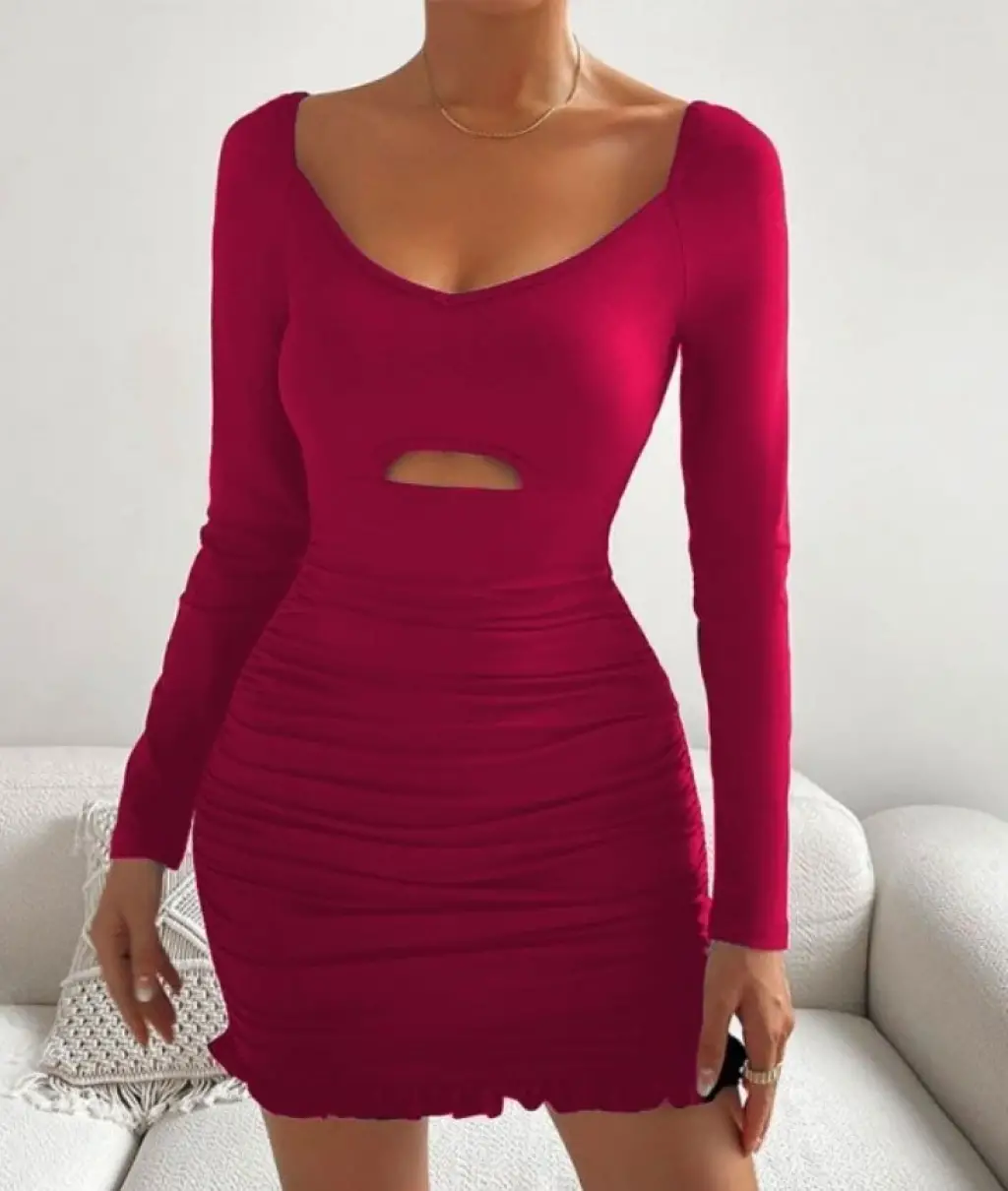Kadın Uzun Kollu Derin V Yaka Göğüs Altı Dekolte Detay Etek Ucu Fırfırlı Sandy Mini Boy Elbise