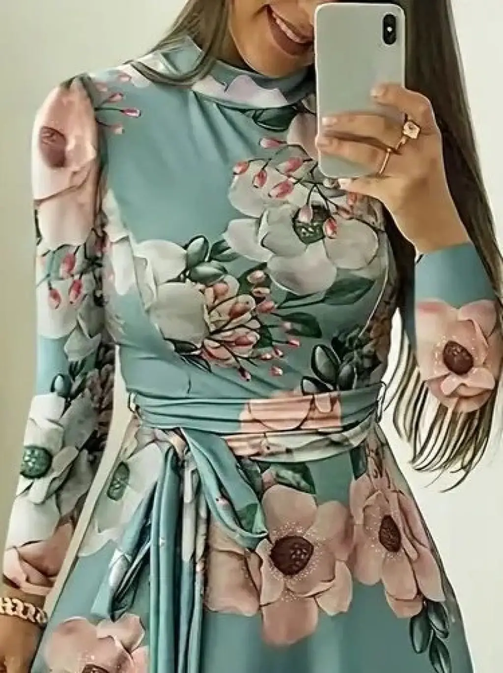 Kadın Uzun Kollu Bisiklet Yaka Belden Bağlamalı Desenli Belden Kuşaklı Mikro Süprem Midi Elbise
