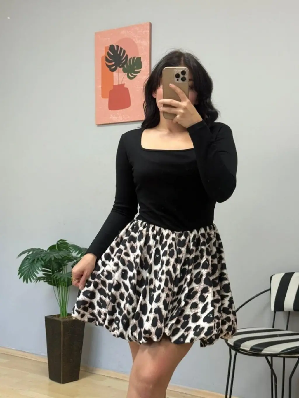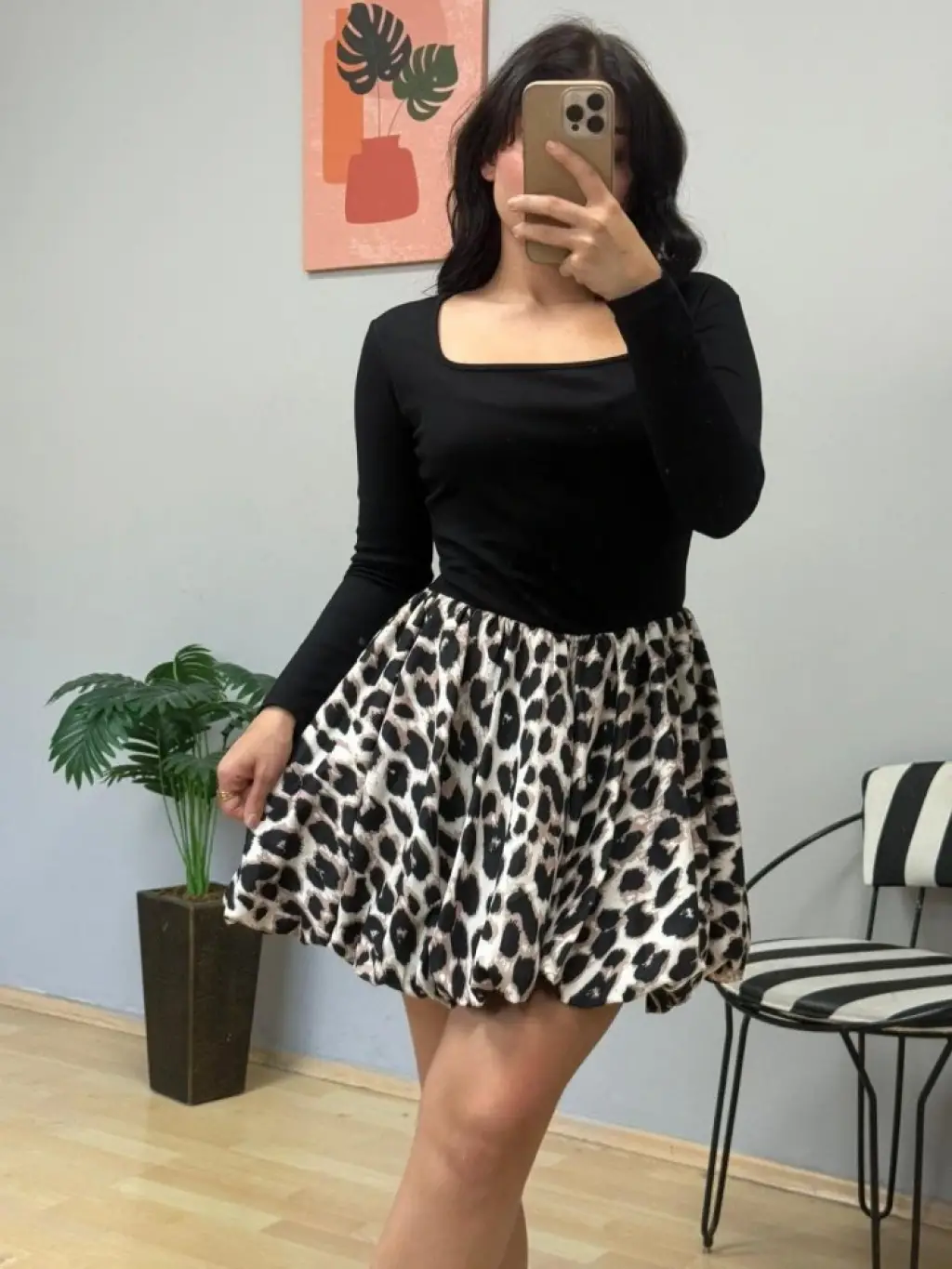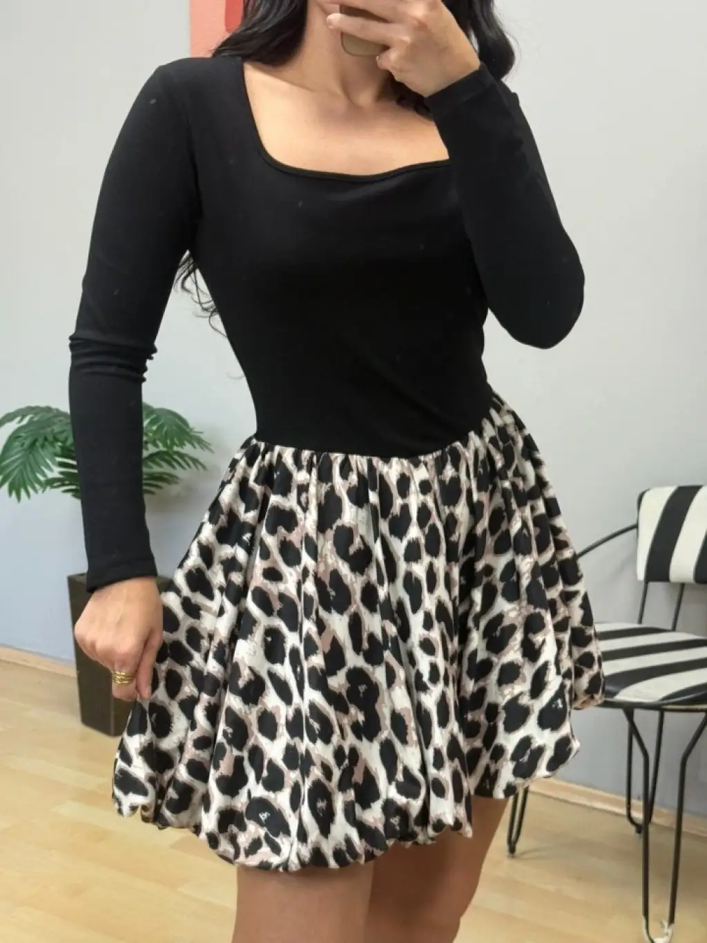 Kadın Uzun Kollu Kare Yaka Mini Balon Modal Elbise