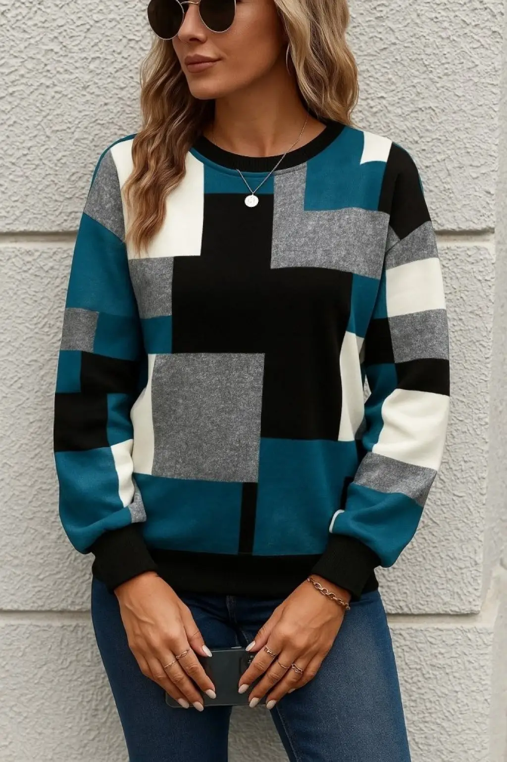 Kadın Uzun Kollu Bisiklet Yaka Renkli Blok Baskı Dalgıç Bluz