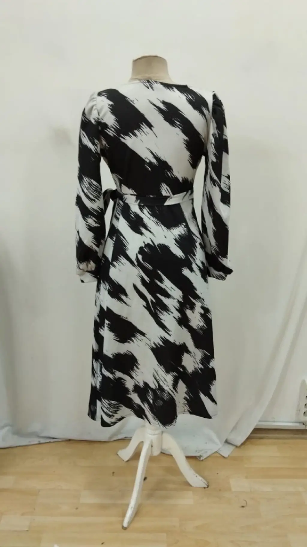 Kadın Uzun Kollu Kruvaze Yakalı Yandan Bağlamalı Desenli Mini Modal Elbise