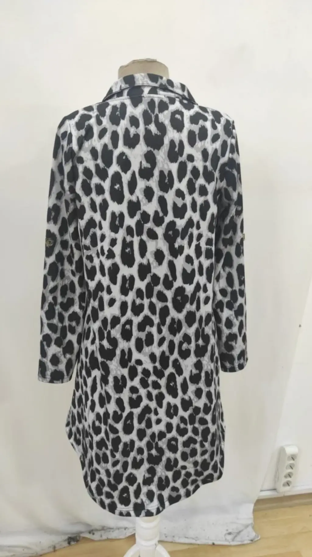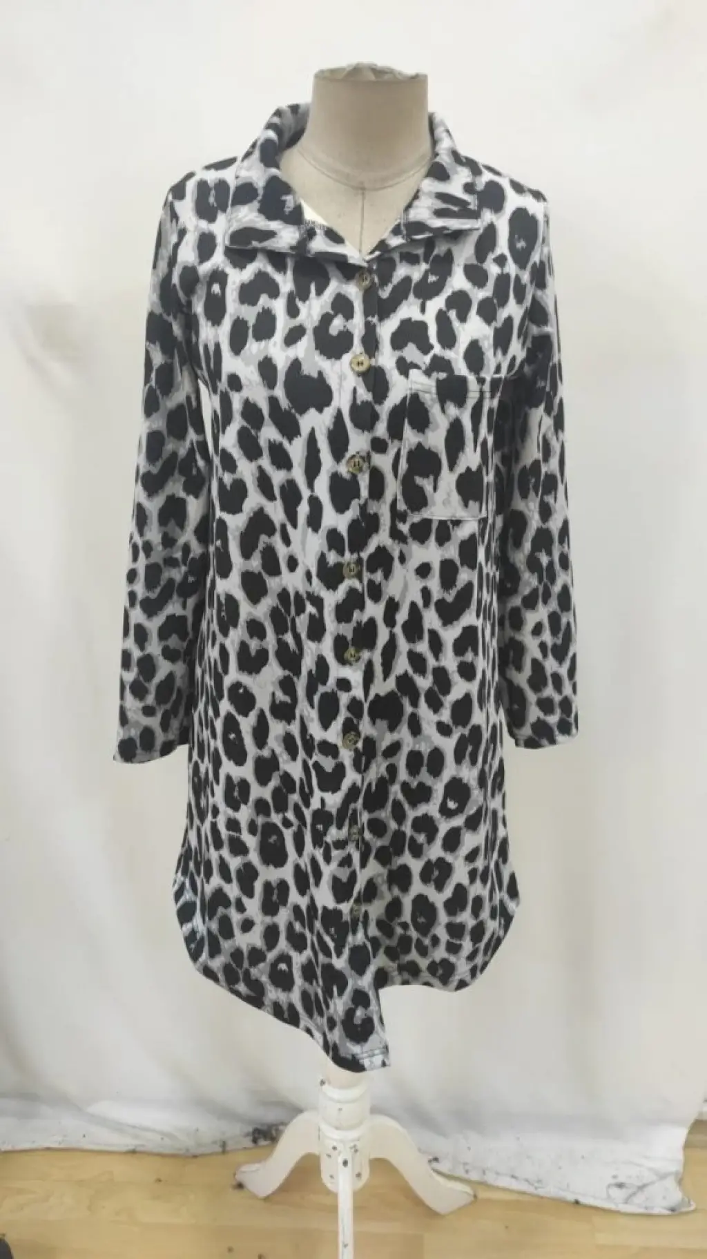 Kadın Uzun Kollu Yakalı önden Düğmeli Leopar Desenli Modal Midi Elbise