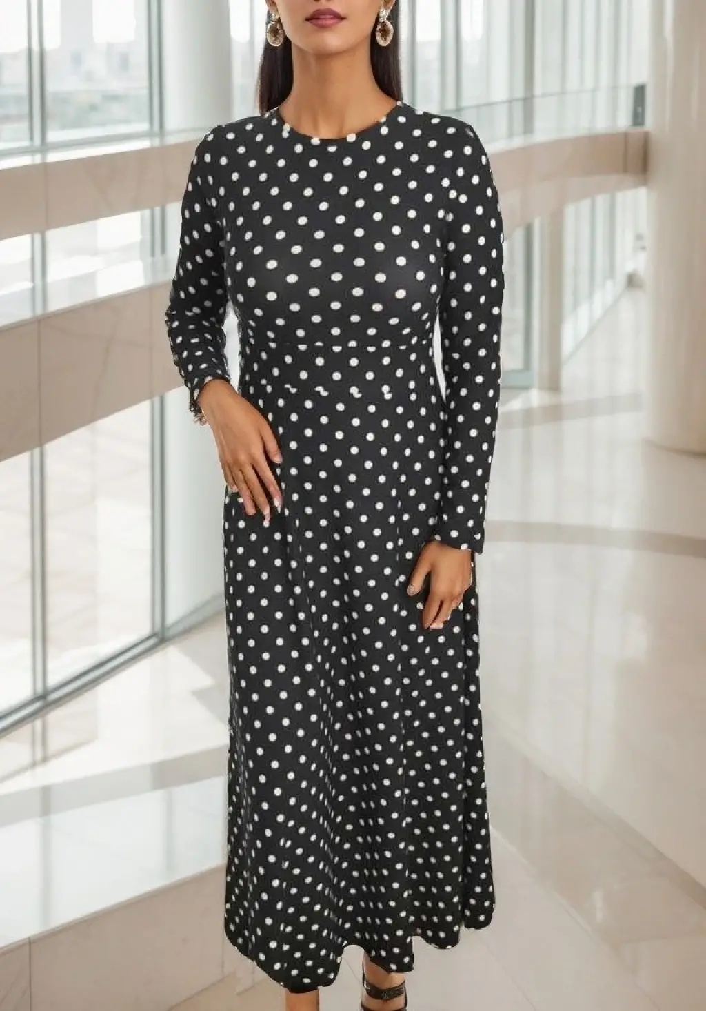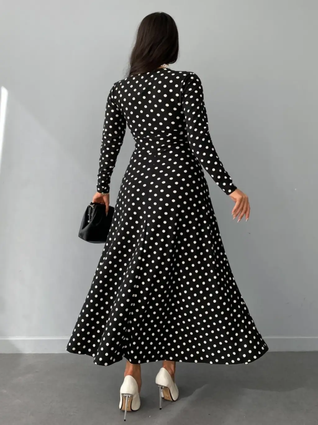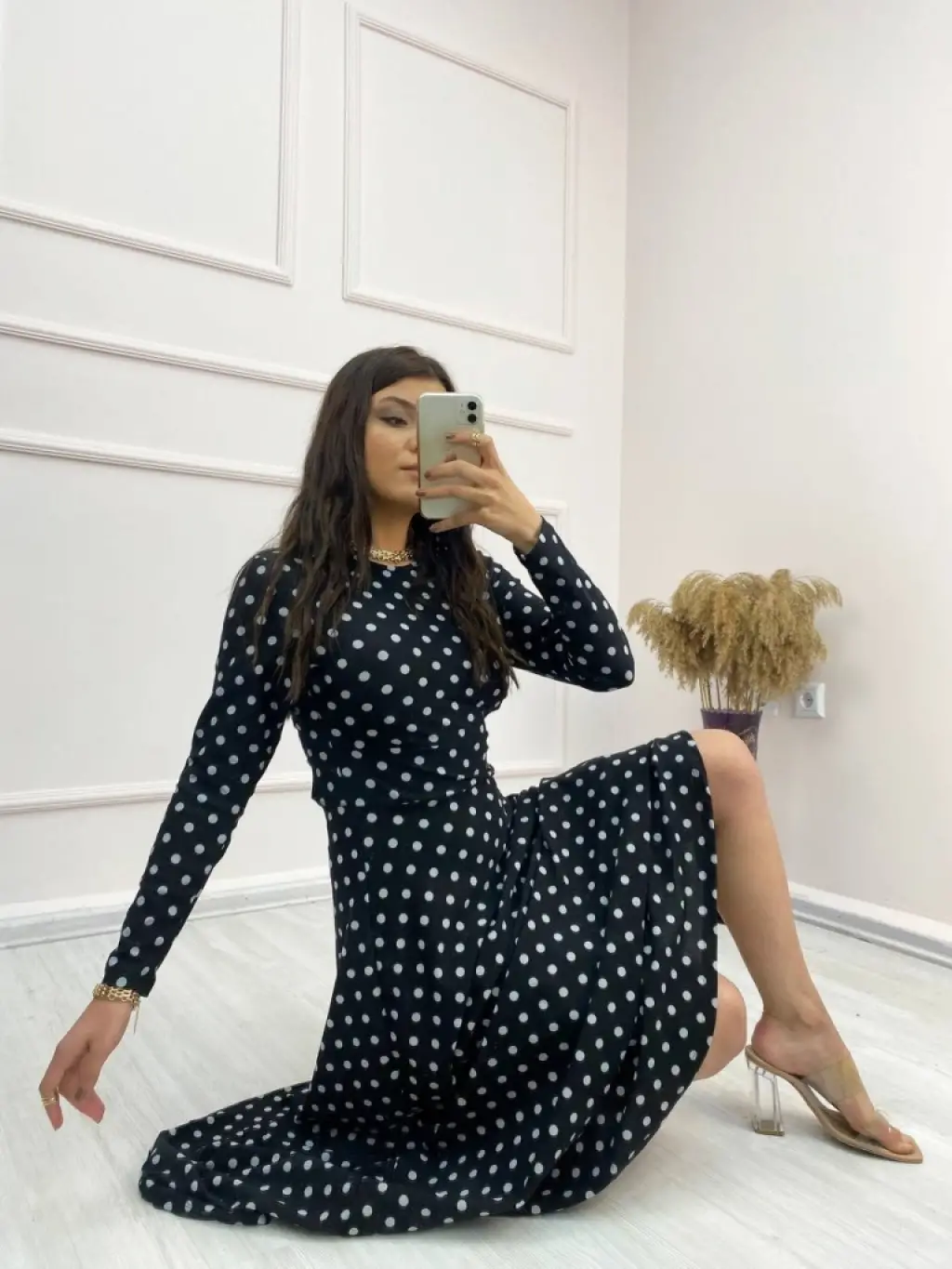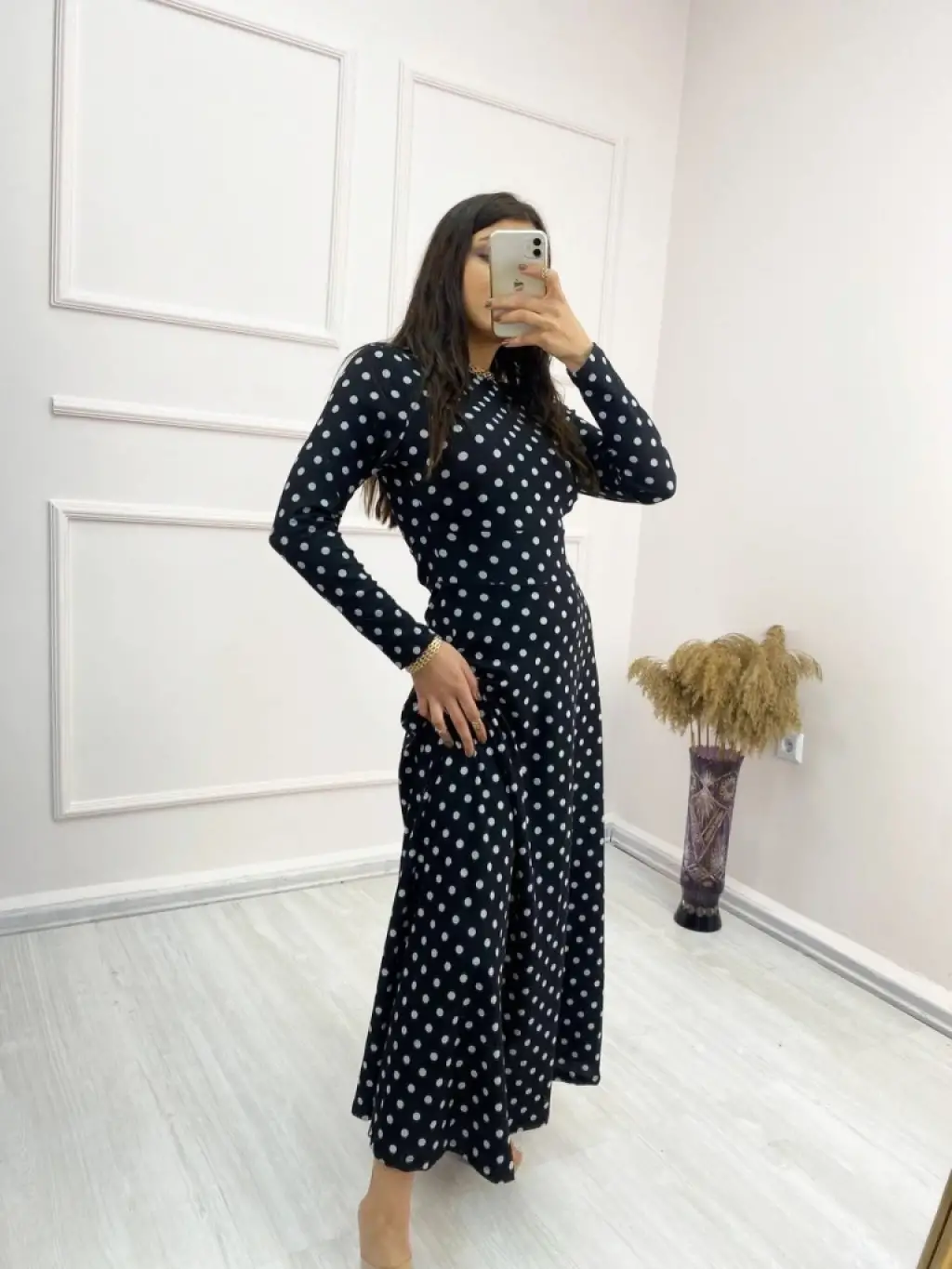 Kadın Siyah Tam Boy Beyaz Puantiyeli Elbise