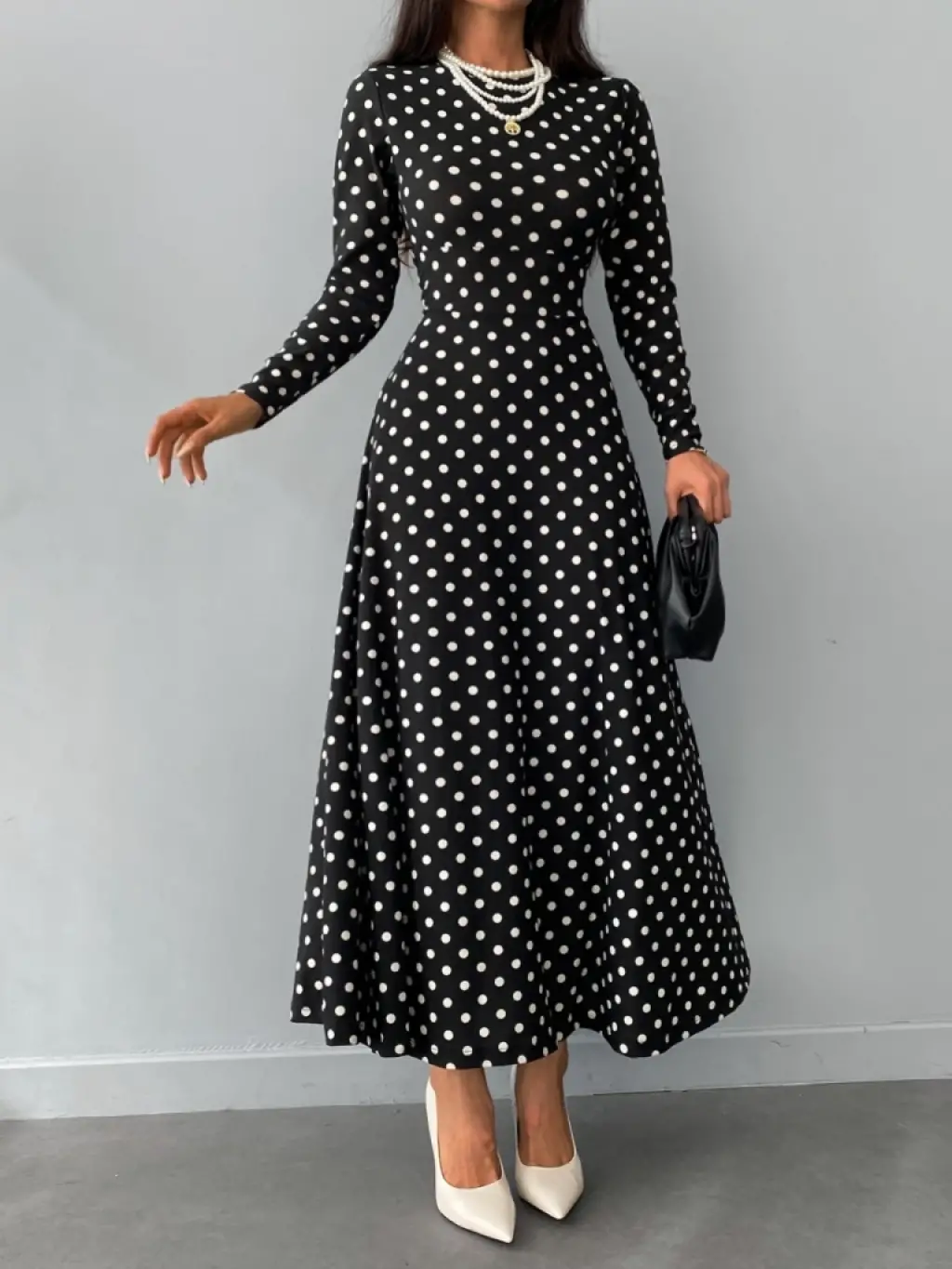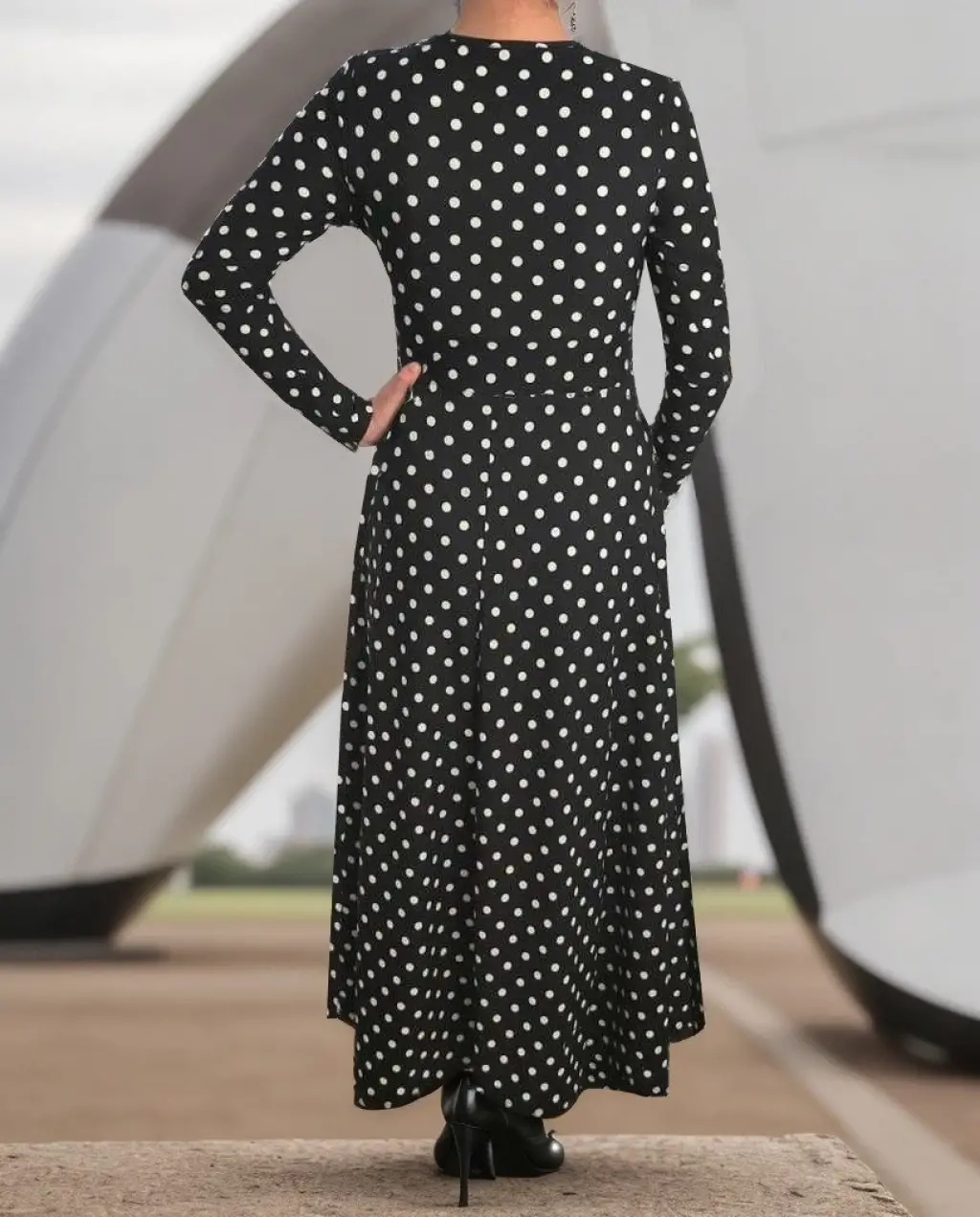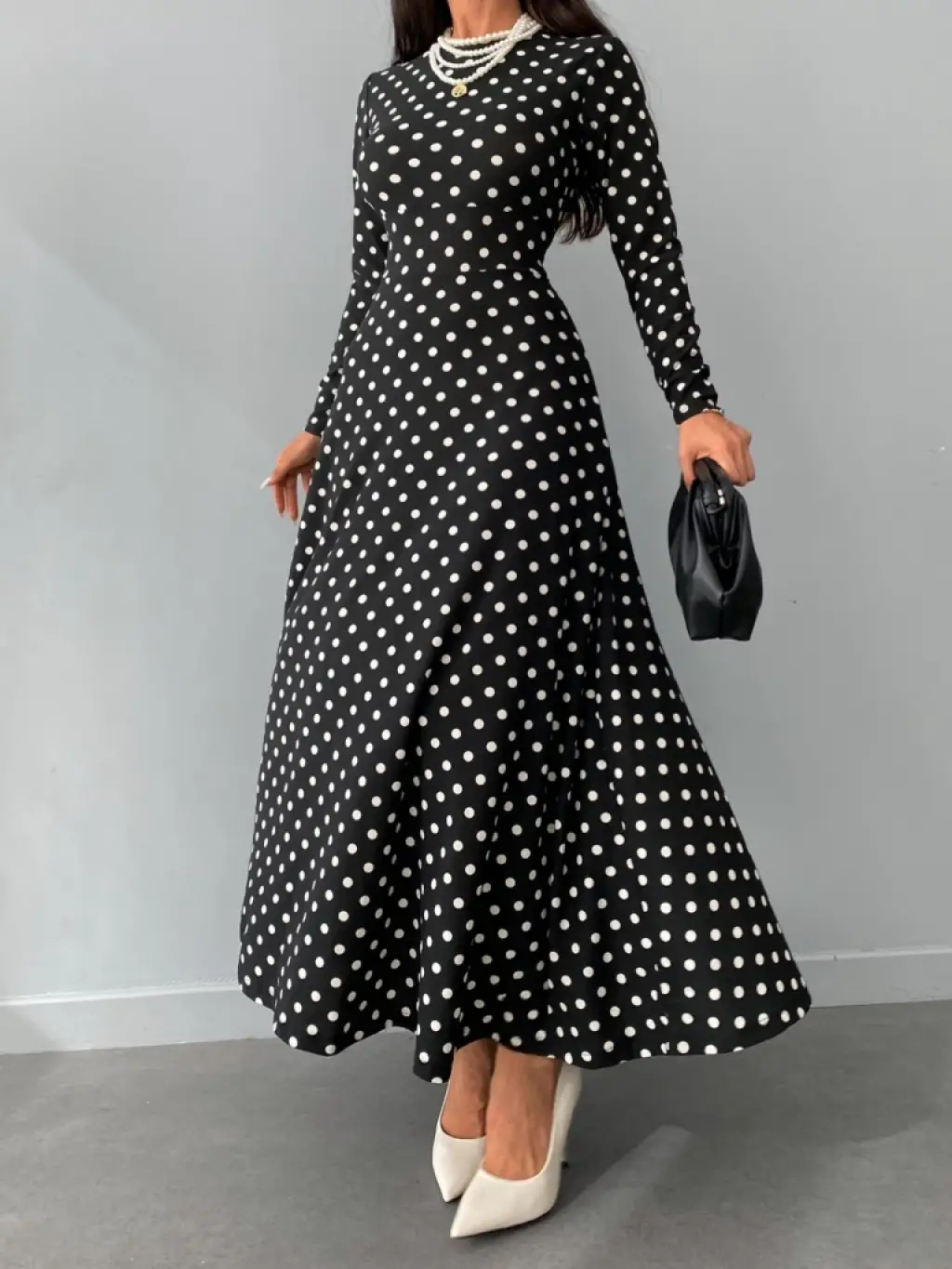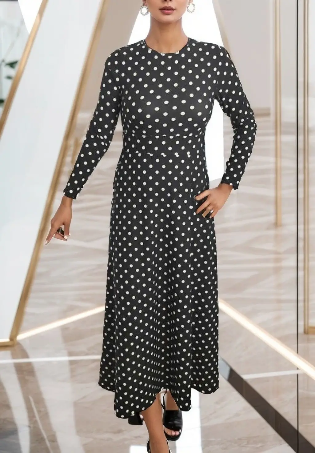 Kadın Siyah Tam Boy Beyaz Puantiyeli Elbise