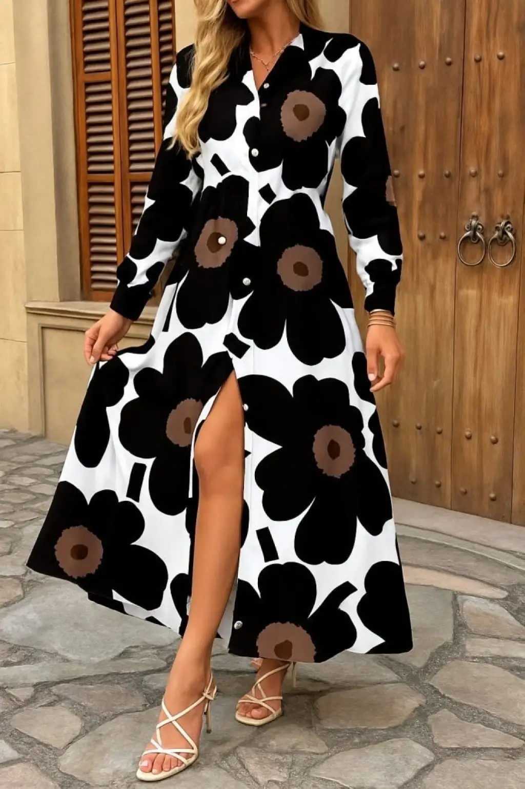 Kadın Yakalı önden Düğmeli çiçek Desenli Uzun Süprem Elbise