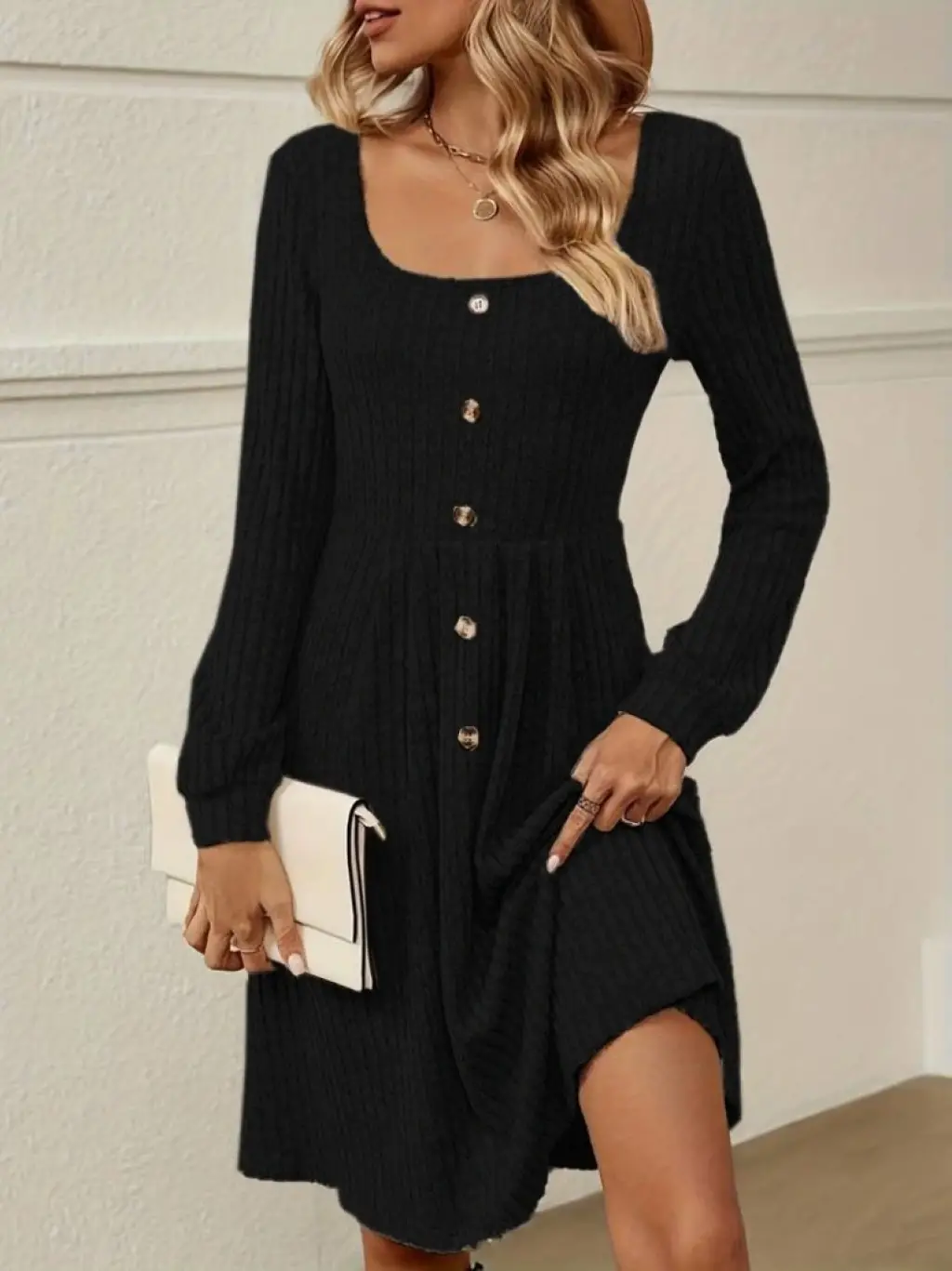 Kadın Uzun Kollu Kare Yaka Düğmeli Kısa şardonlu Iki Iplik Mini Elbise
