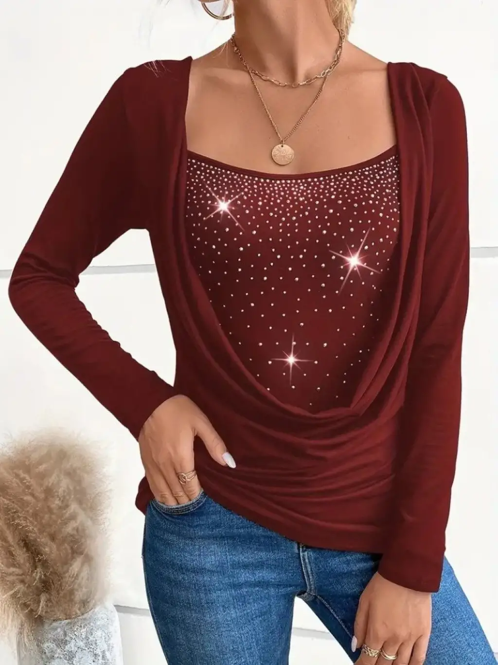 Kadın Uzun Kollu Derin Degaje Yakalı Taşlı Sandy Bluz