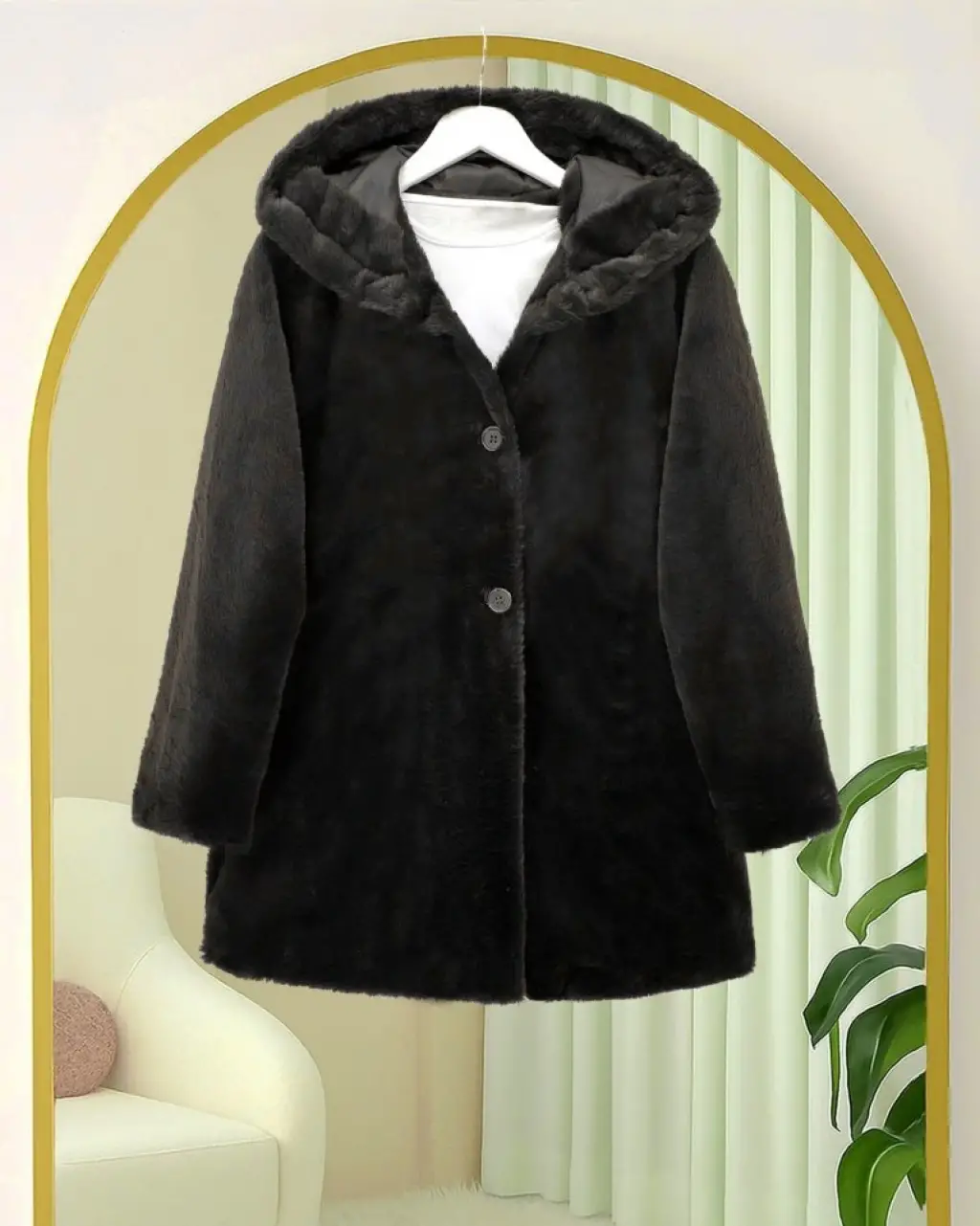 Kapşonlu Önü Düğmeli Astarlı Peluş Kaban -Siyah