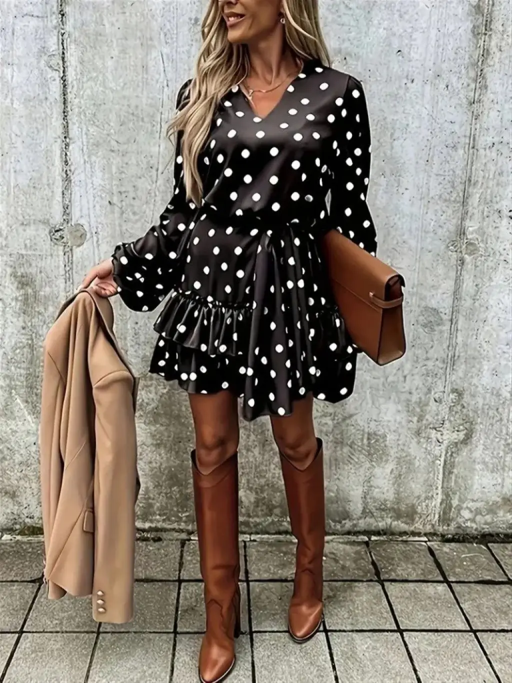 Kadın Uzun Kollu V Yakalı Belden Kuşaklı Puantiyeli Mini Modal Elbise