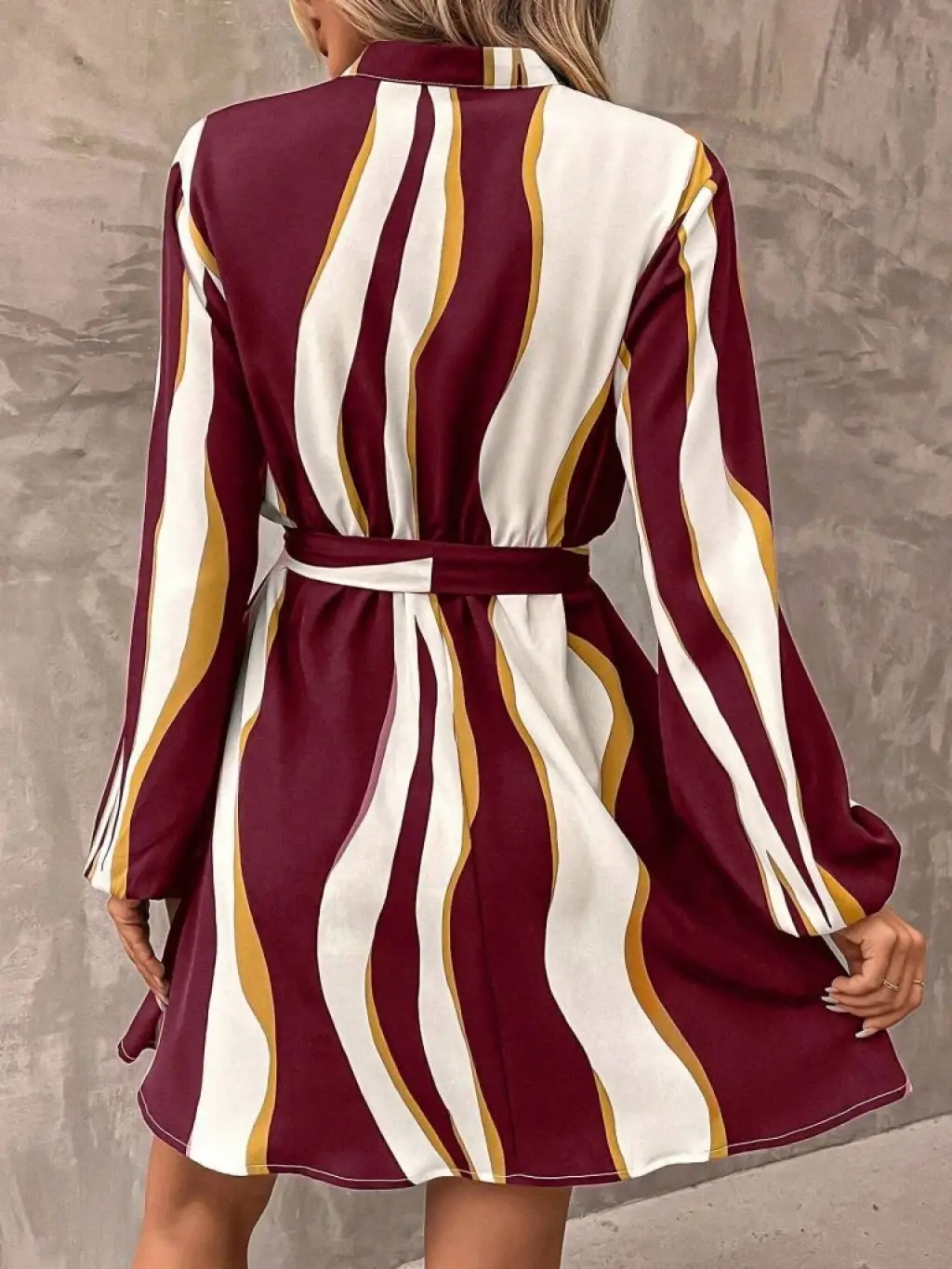 Kadın Uzun Kollu Eteği Fırfırlı Beli Kuşaklı Trikoton Tam Boy Gömlek Elbise