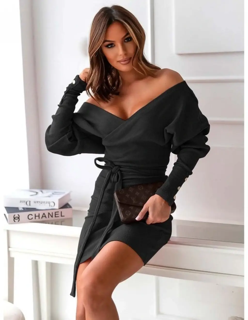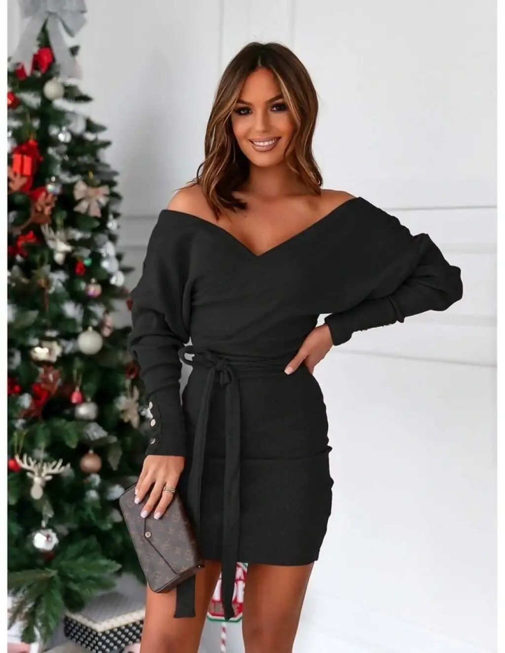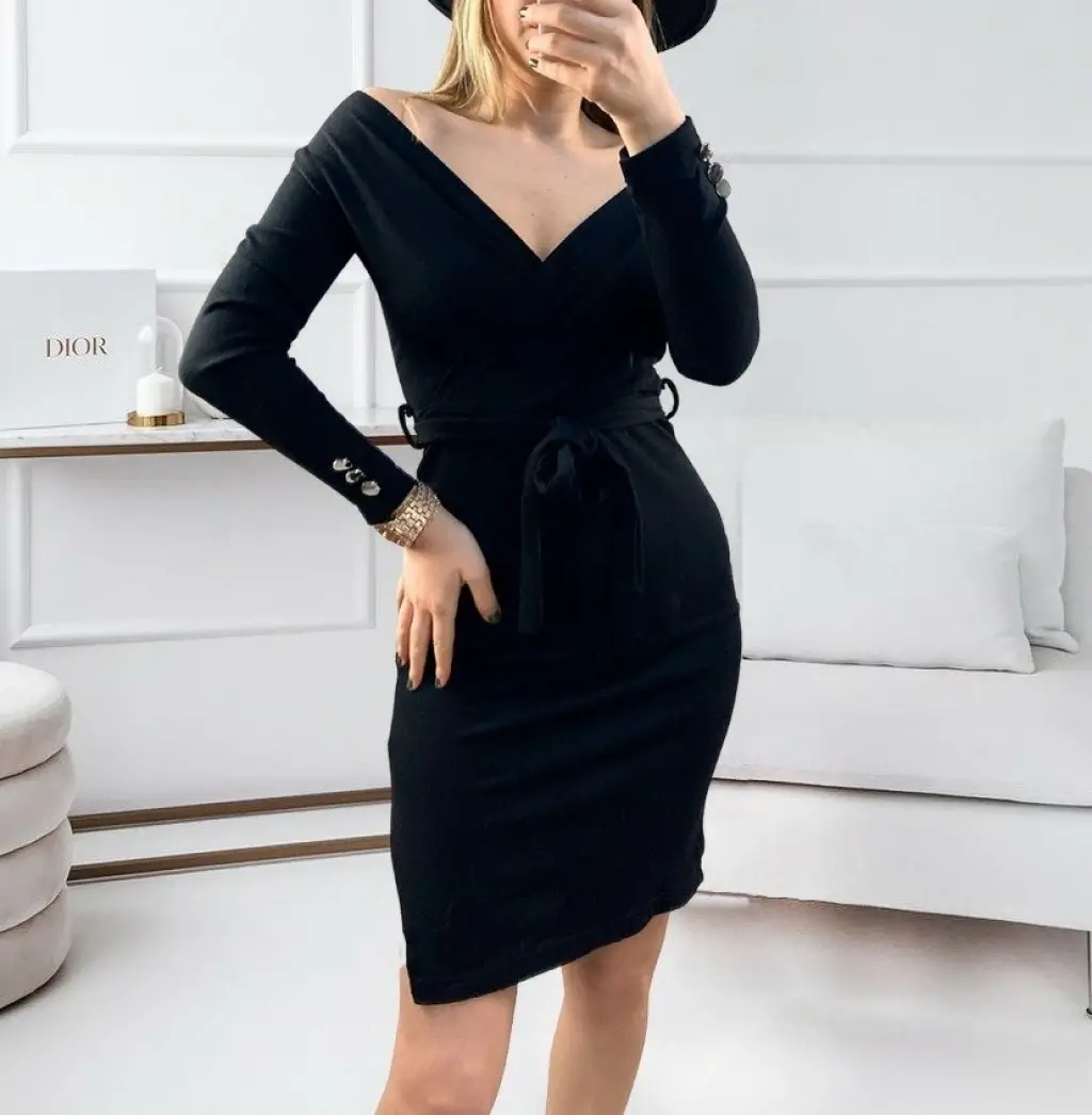 Kadın Uzun Kollu Kruvaze Yaka Bağcık Detay Akrilik Mini Boy Elbise