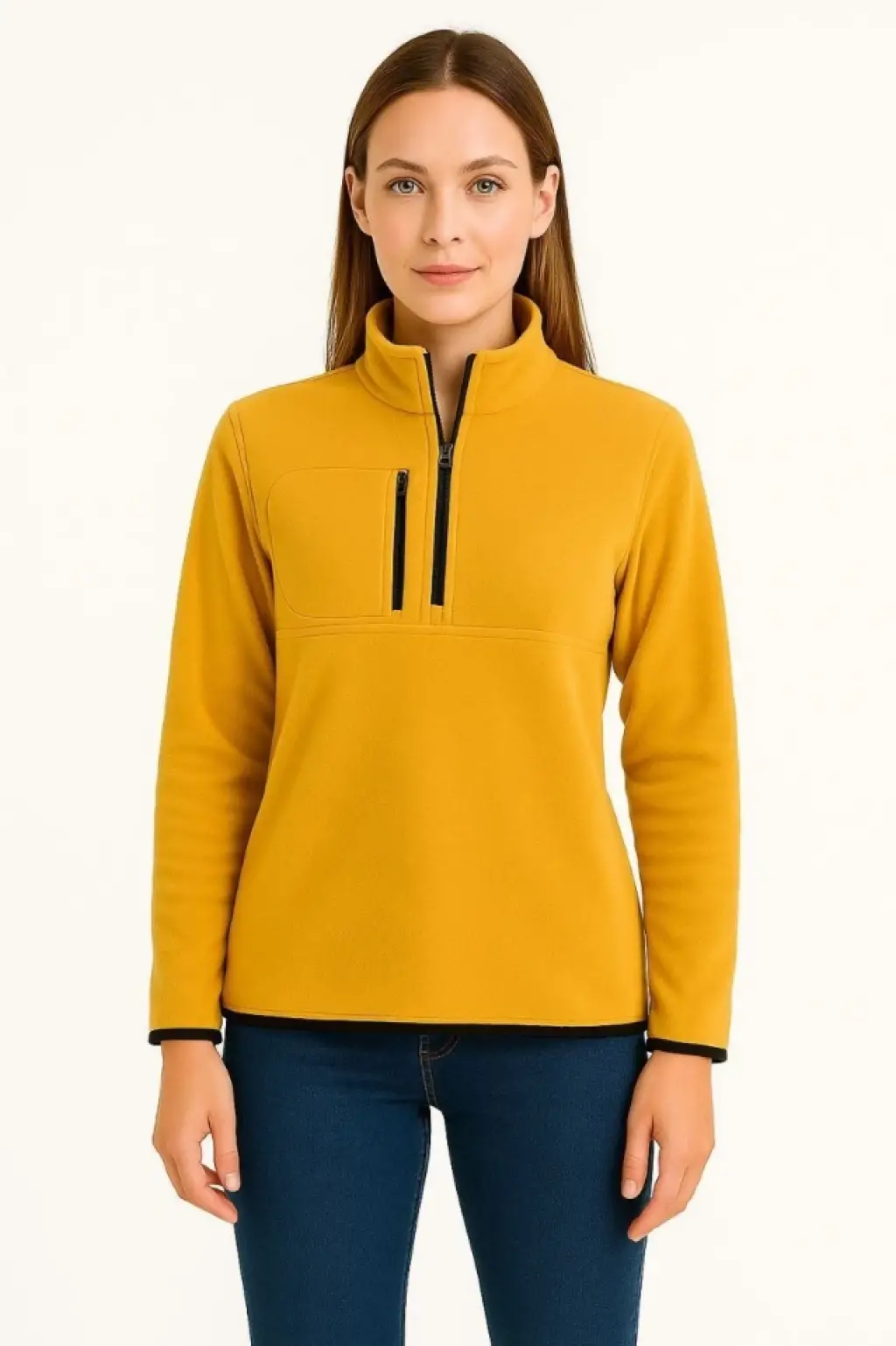 Polar Kazak – Dik Yaka, Yarım Fermuarlı, Fermuarlı Göğüs Cepli, Siyah Biyeli, Kışlık Rahat Regular Fit Günlük Model - Sarı