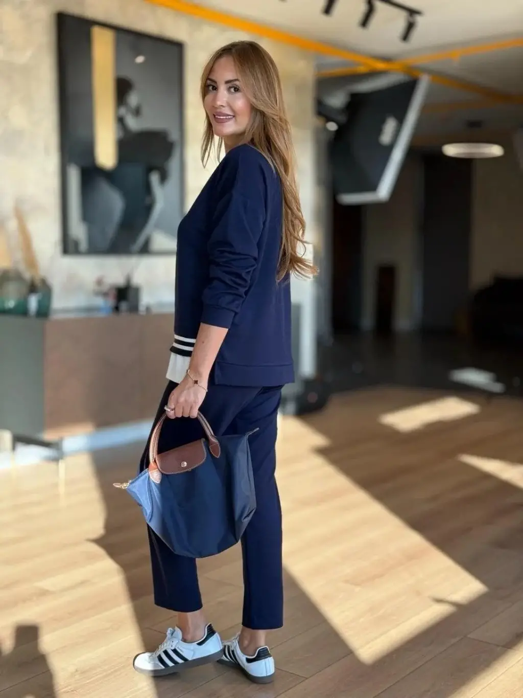 Kadın Uzun Kollu Bisiklet Yaka çizgili Desen Iki Iplik Bluz Ve Pantolon Ikili Takım