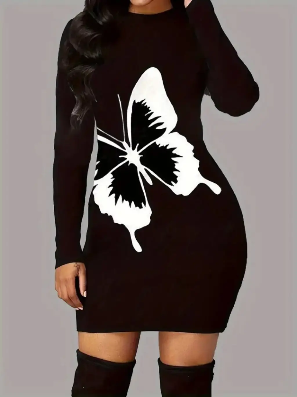 Kadın Uzun Kollu Bisiklet Yaka Kelebek Desenli Kısa Viskon Iki Iplik Elbise