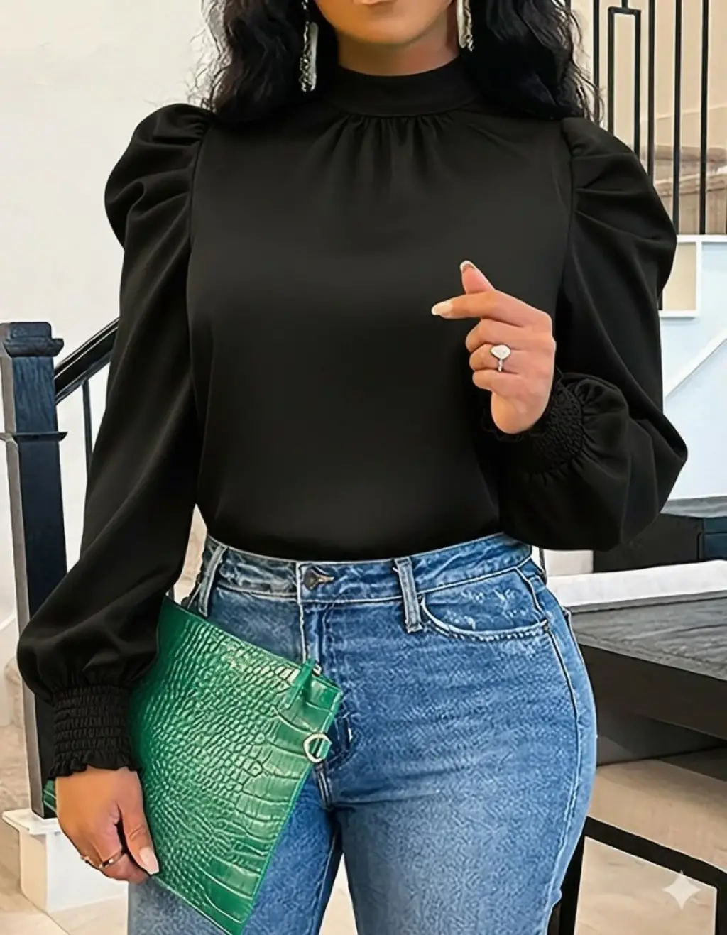 Kadın Uzun Kollu Balıkçı Yaka Arkadan Bağlamalı Omuzlardan Balon Ithal Krep Bluz