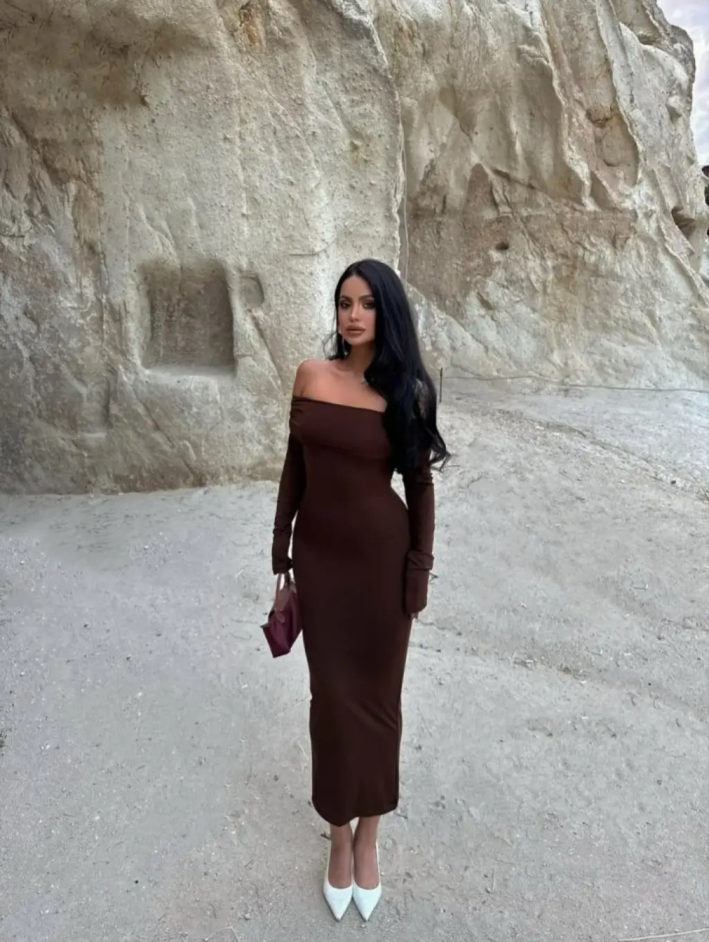 Kadın Uzun Kollu Madonna Yaka Midi Boy Elbise