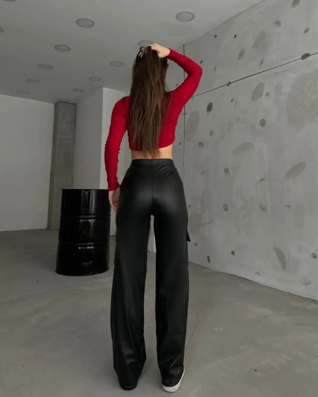 Kadın Yüksek Bel Cepli Deri Pantolon