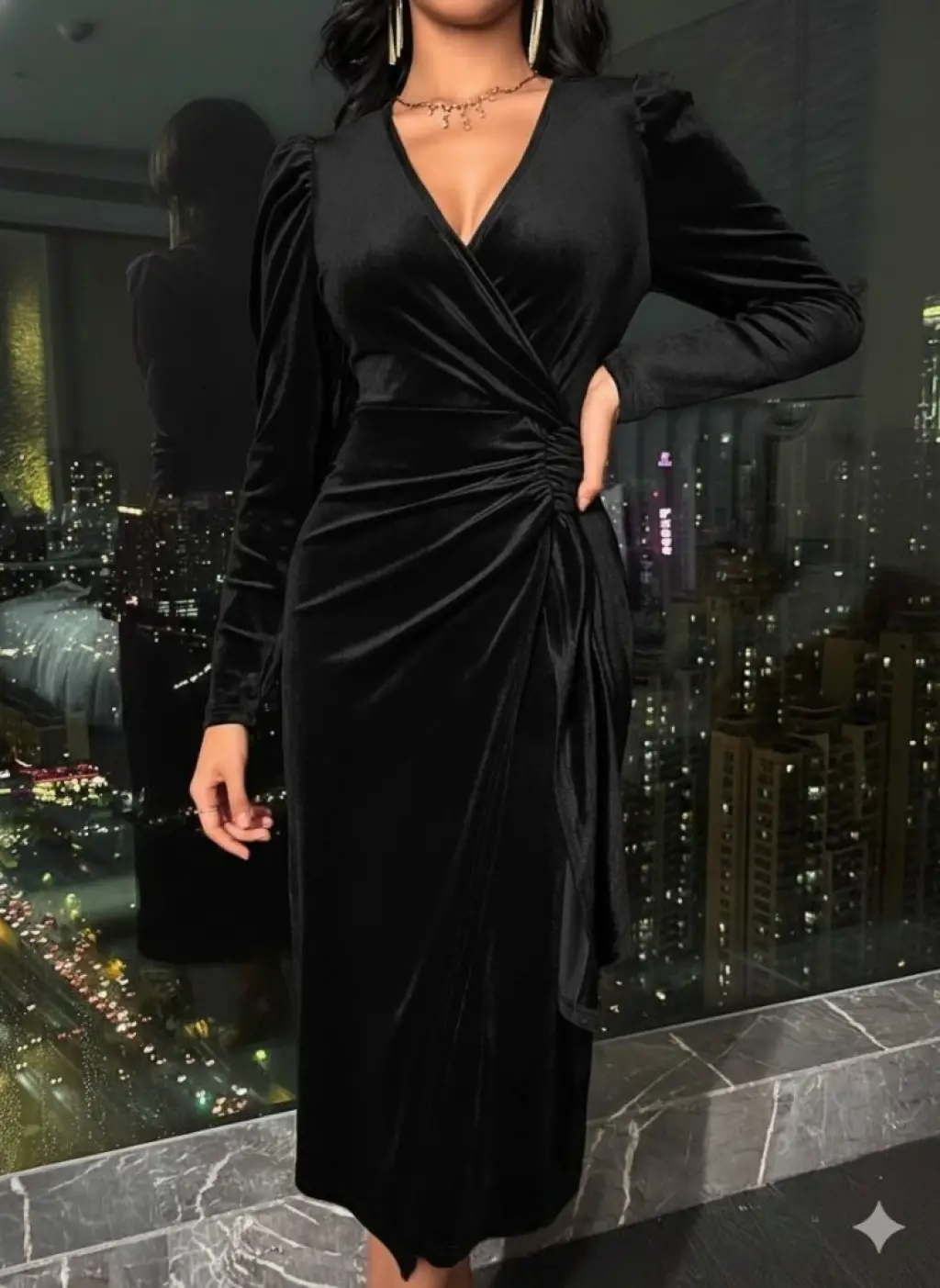 Kadın Uzun Kollu Kruvaze Yakalı Yandan Büzgülü Midi Kadife Elbise