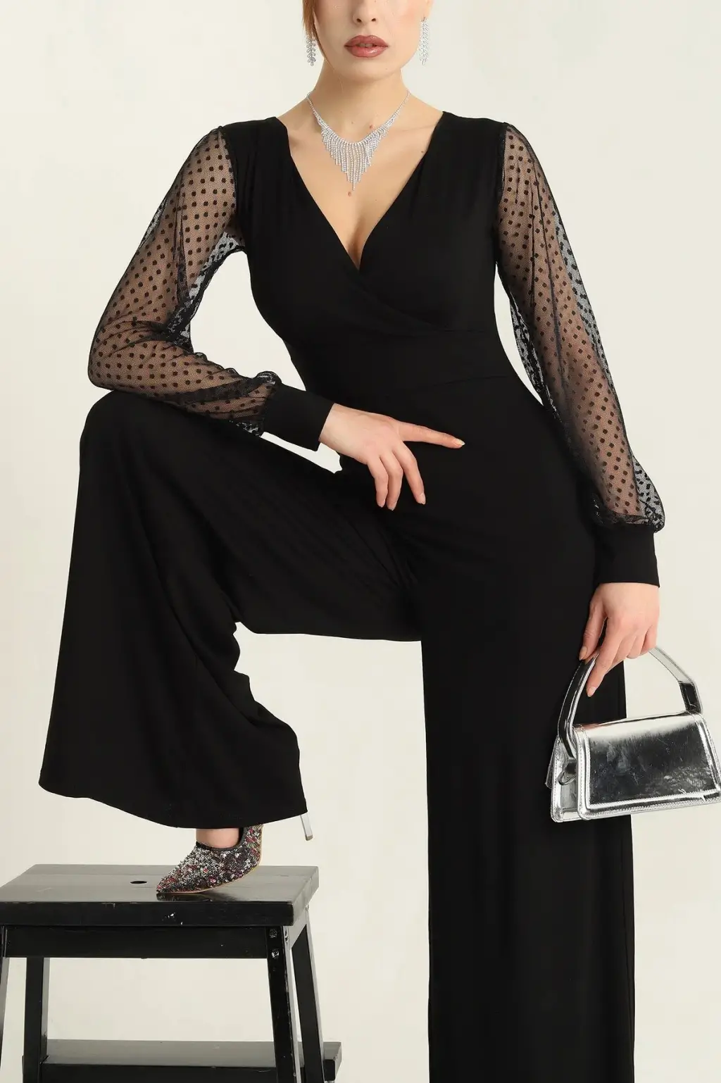 Kadın Derin V Yaka Kolları Puantiyeli Tül Detay Ispanyol Paça Tulum