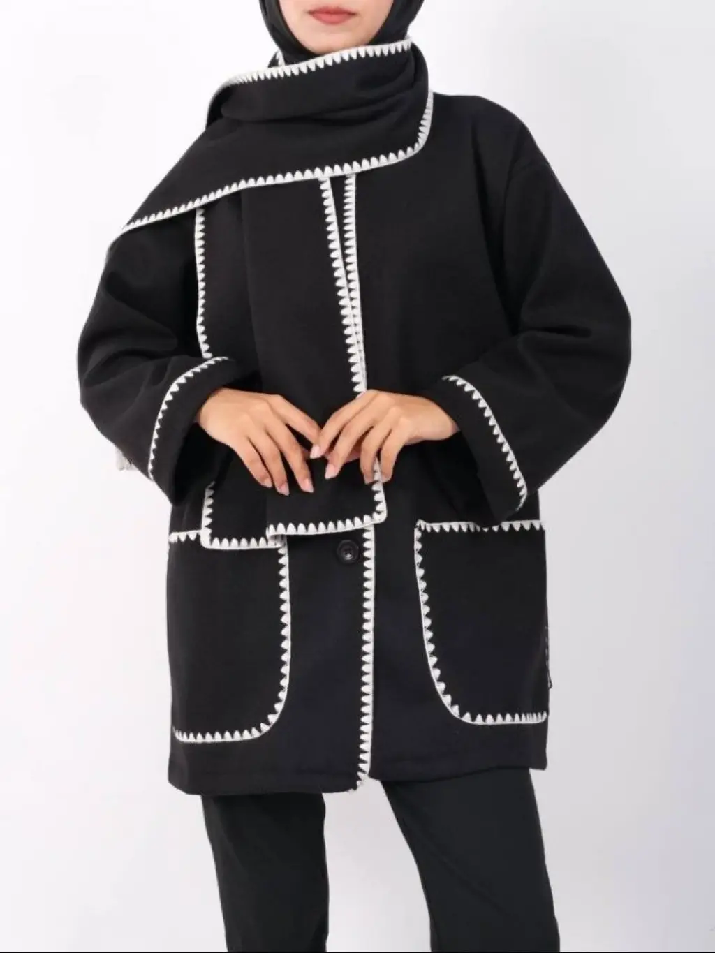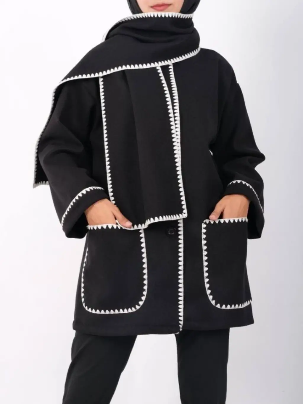 Önü Düğmeli Atkılı Cepli Ceket -Siyah