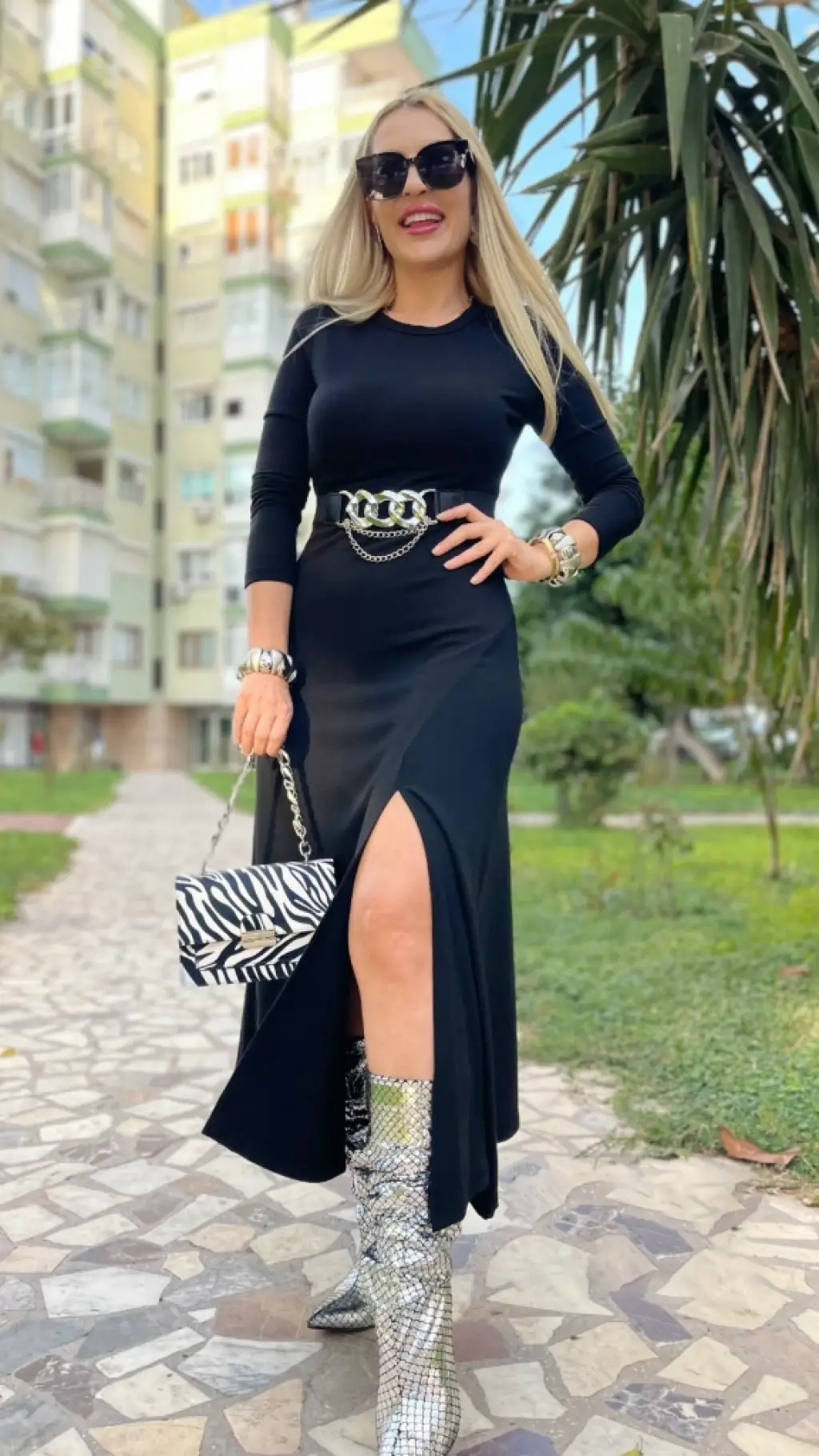 Kadın Truvakar Kollu Bisiklet Yaka Kemersiz Yırtmaç Detaylı Uzun Ithal Krep Elbise