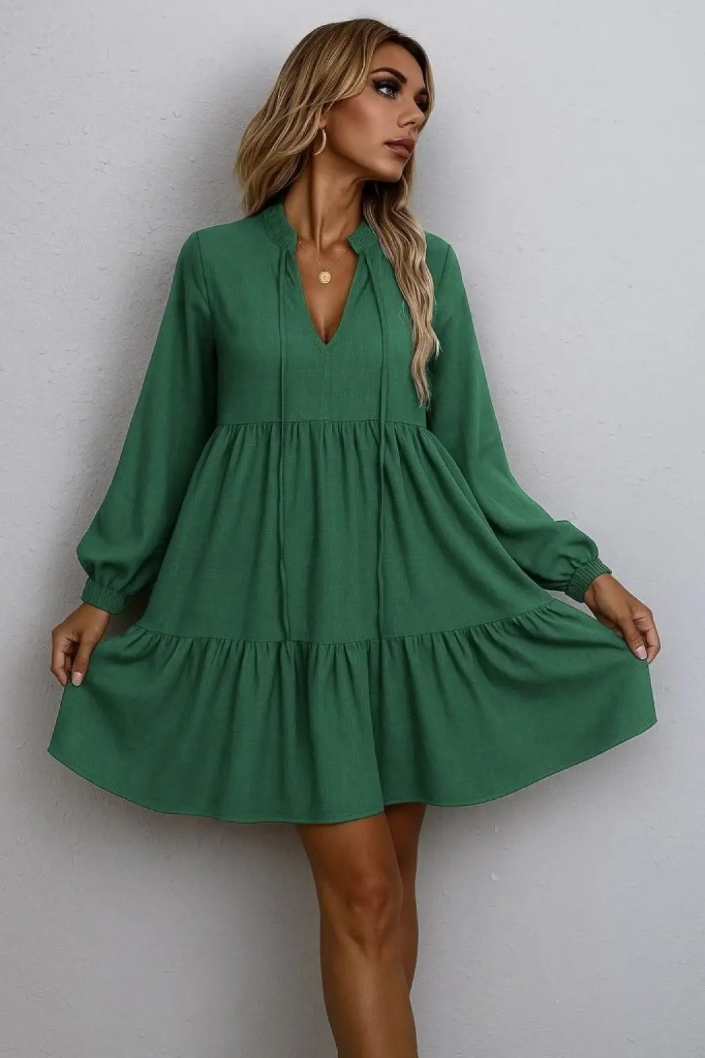 Kadın Uzun Kollu Yakadan Bağcıklı Fırfırlı Keten Mini Elbise