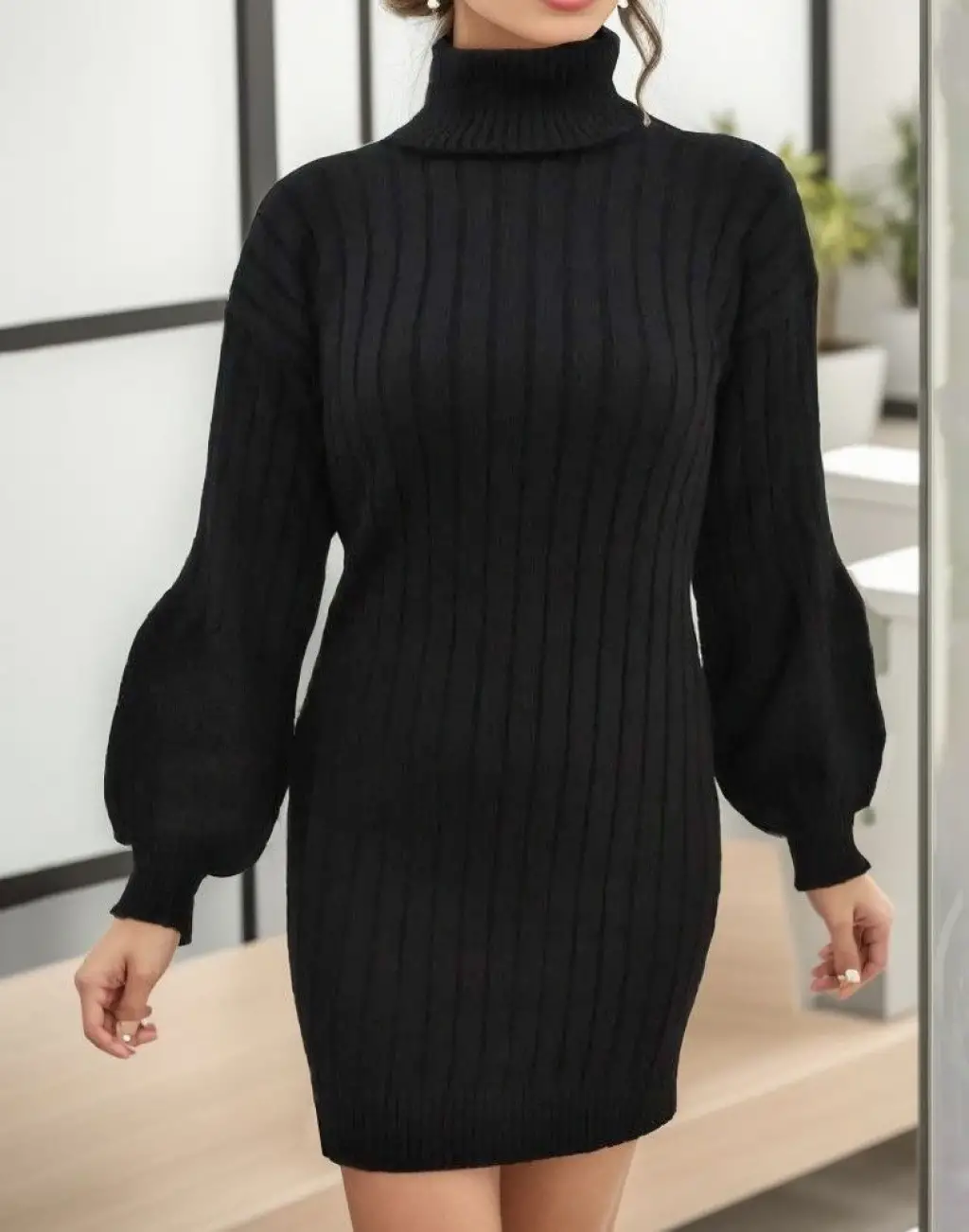 Kadın Uzun Kollu Boğazlı Uzun Balon Kol Triko Mini Elbise