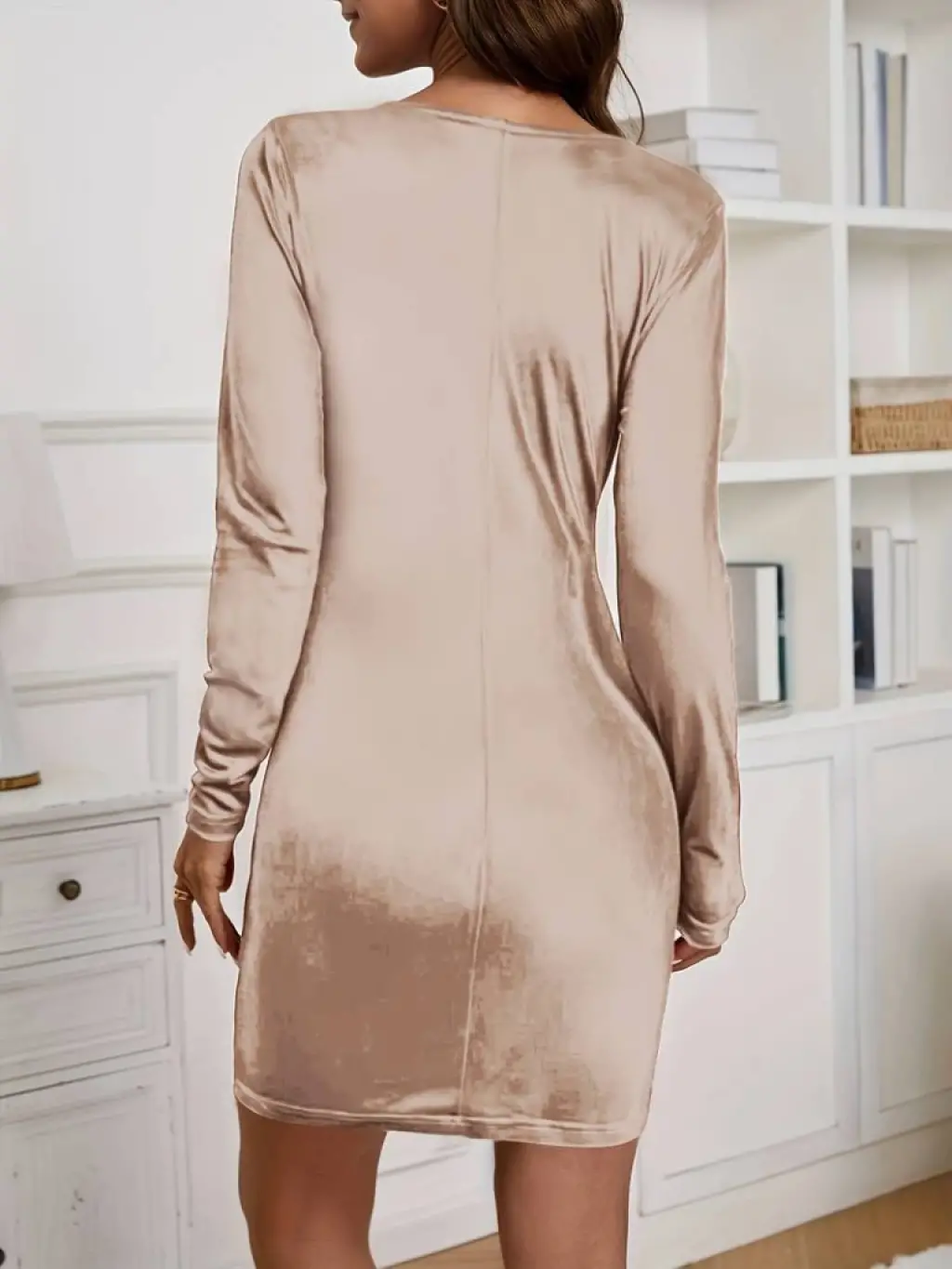 Kadın Uzun Kollu Göğüs Dekolteli Kadife Kumaş Mini Kruvaze Elbise