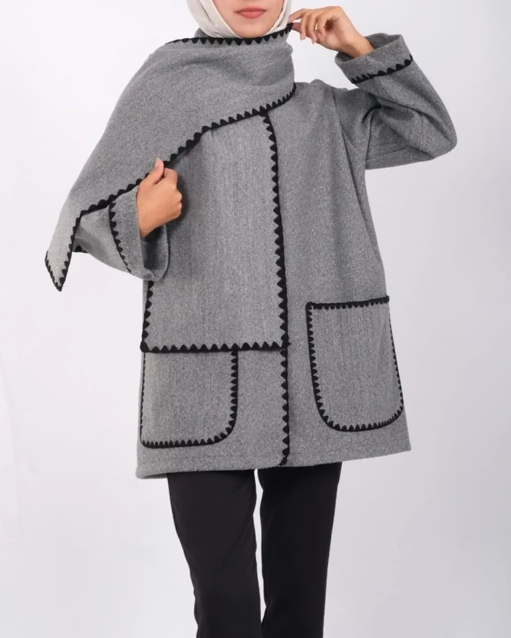 Gri Önü Düğmeli Atkılı Cepli Ceket