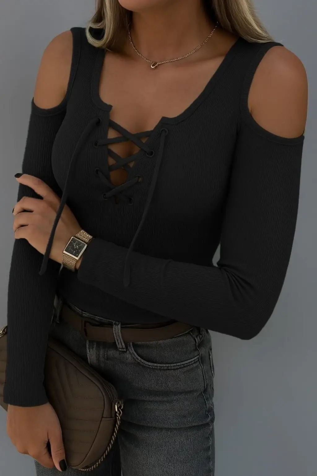 Kadın Omuzlardan Açık Uzun Kollu Bağcıklı Kaşkorse Bluz