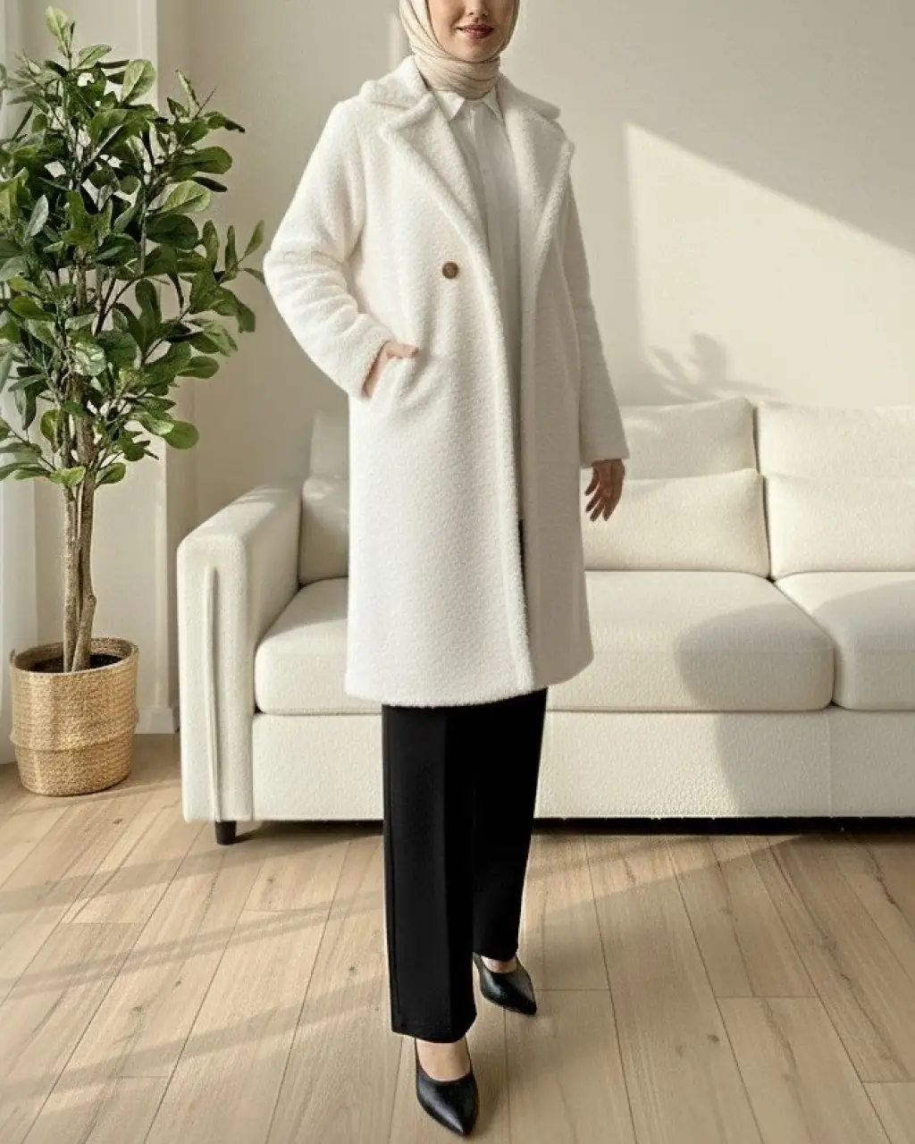 Çift Düğmeli Astarlı Yan Cepli Peluş Kaban -Ekru