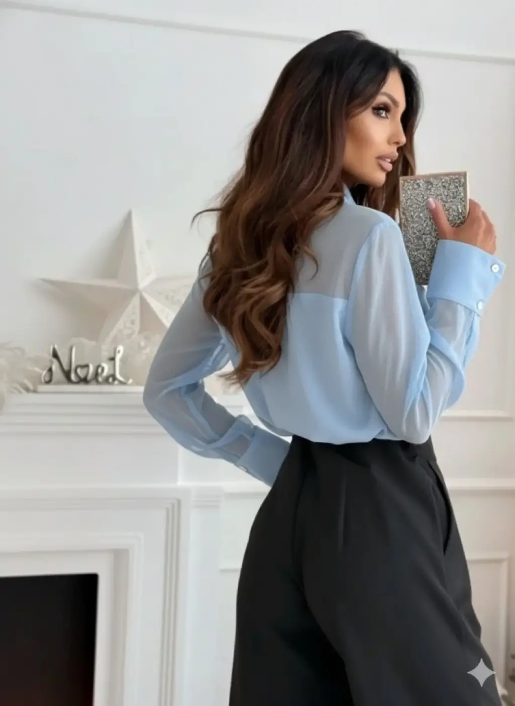 Kadın Uzun Kollu Balıkçı Yaka önden Düğmeli Bluz Ve Pantolon Yumoş Ikili Takım