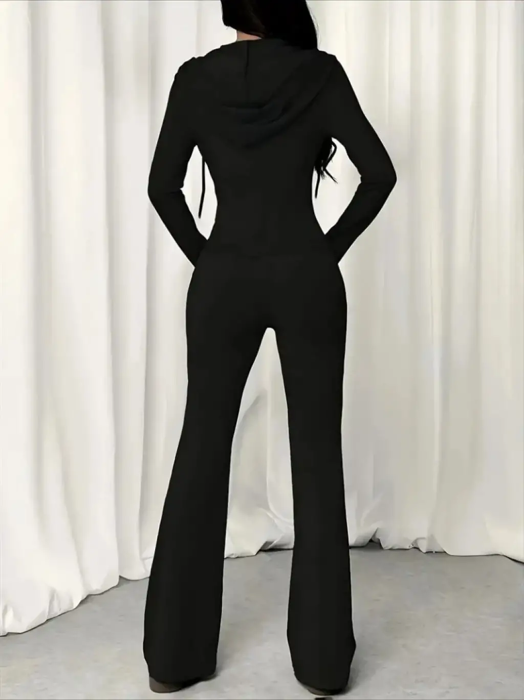 Kadın Uzun Kollu Kapşonlu Bağcıklı önü Fermuarlı Viskon Iki Iplik Bluz Ve Pantolon Ikili Takım