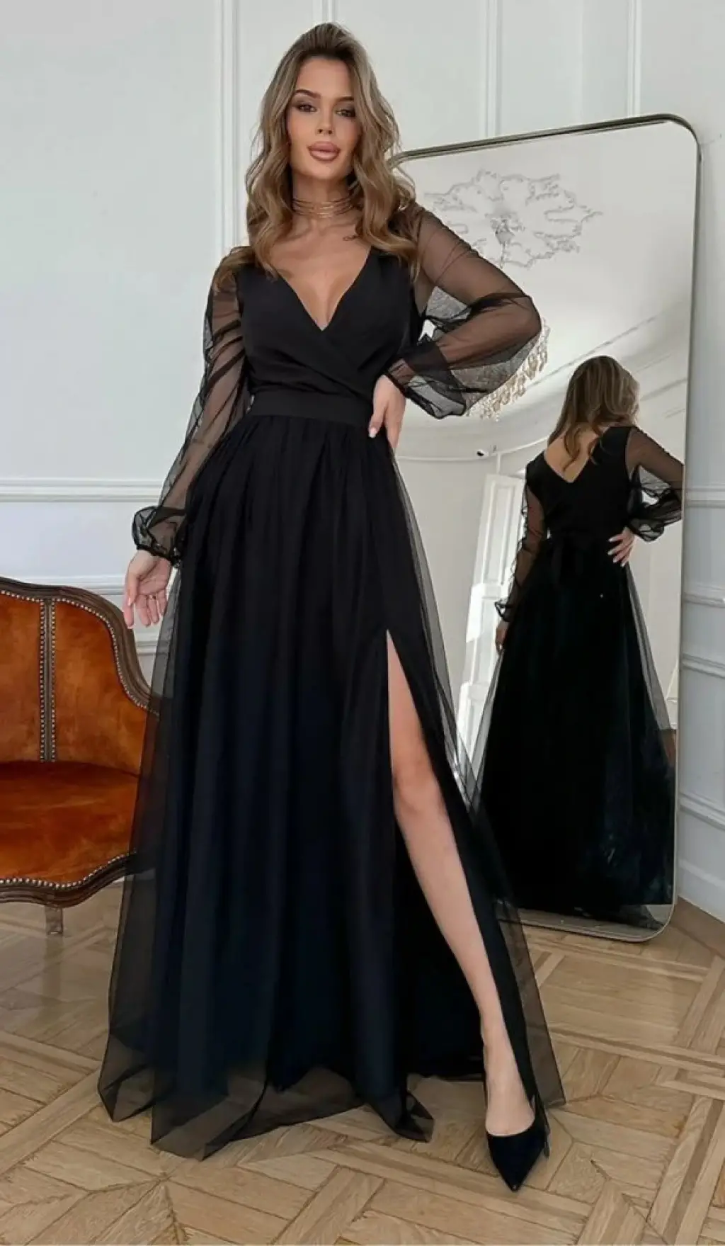 Kadın Uzun Kollu Derin V Kruvaze Yaka Beli Lastik Yırtmaç Ve Bağcık Detaylı Sandy Tam Boy Elbise