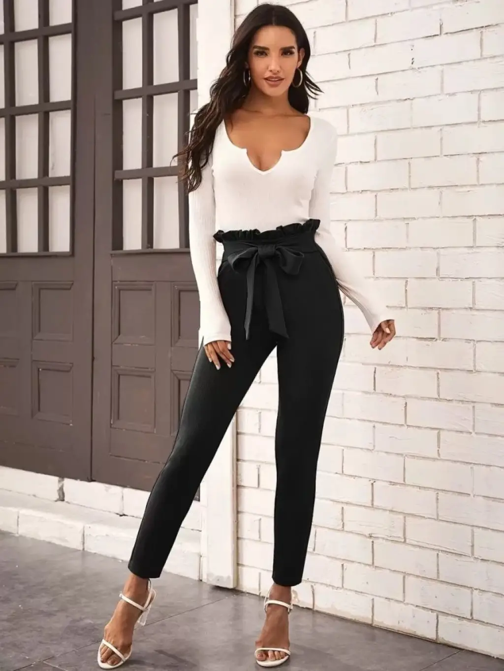 Kadın Yüksek Bel Beli Fırfırlı önden Bağlamalı Ithal Krep Pantolon