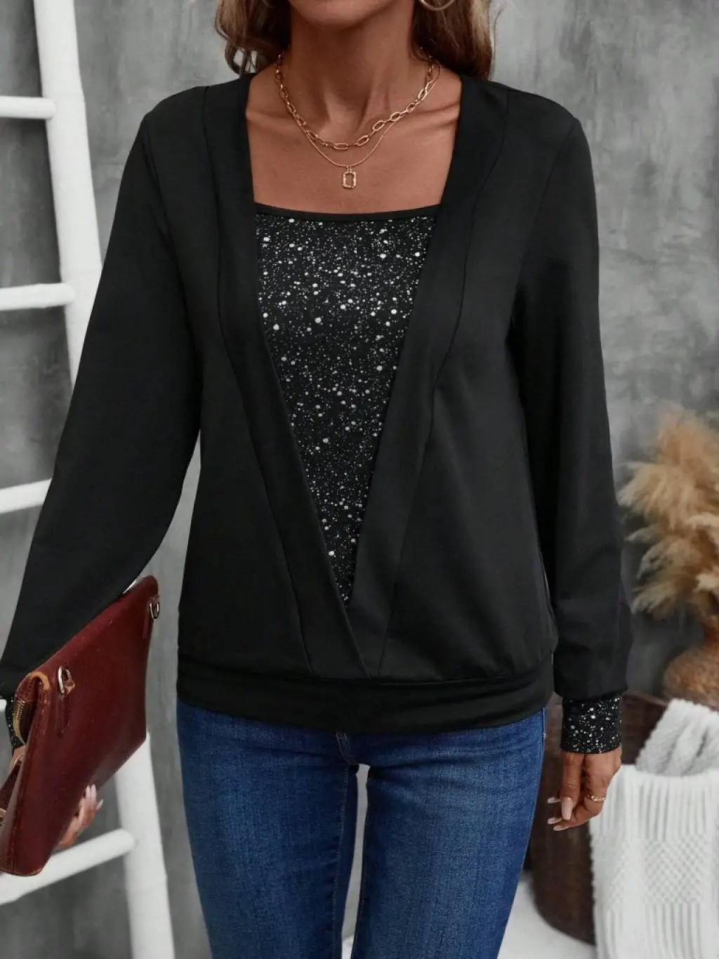 Kadın Uzun Kollu Yarı Balıkçı Yaka Pencere Detaylı Kolları Kalp Desen Taşlı Viskon Bluz
