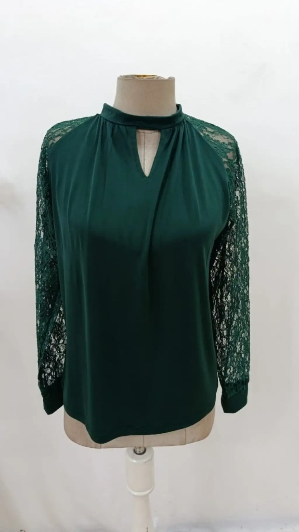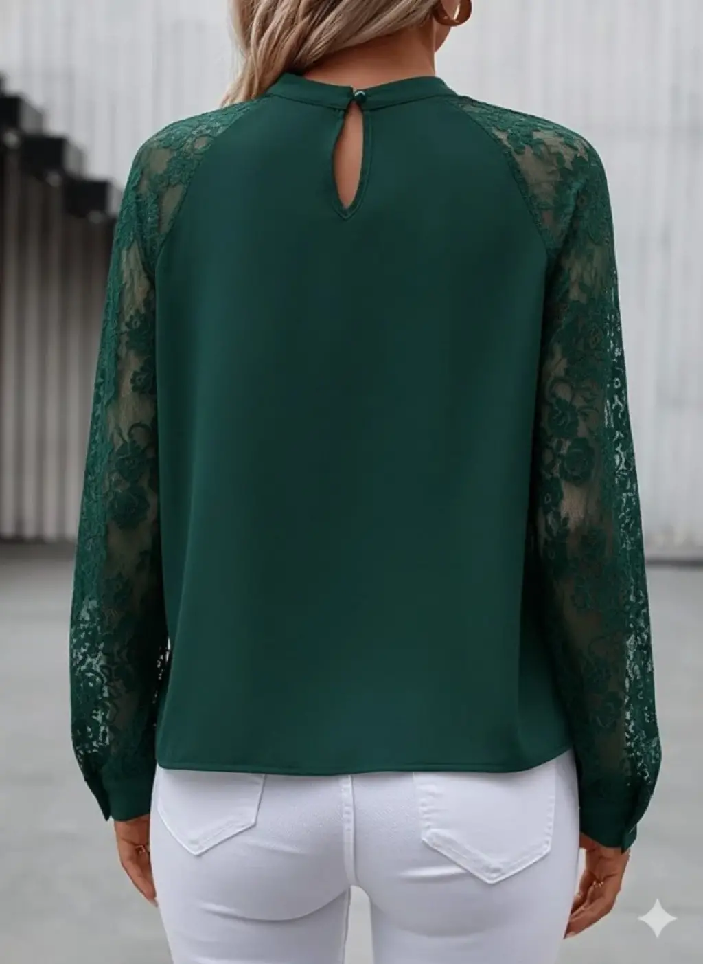 Kadın Uzun Dantel Kollu Yuvarlak Yakalı Sandy Bluz