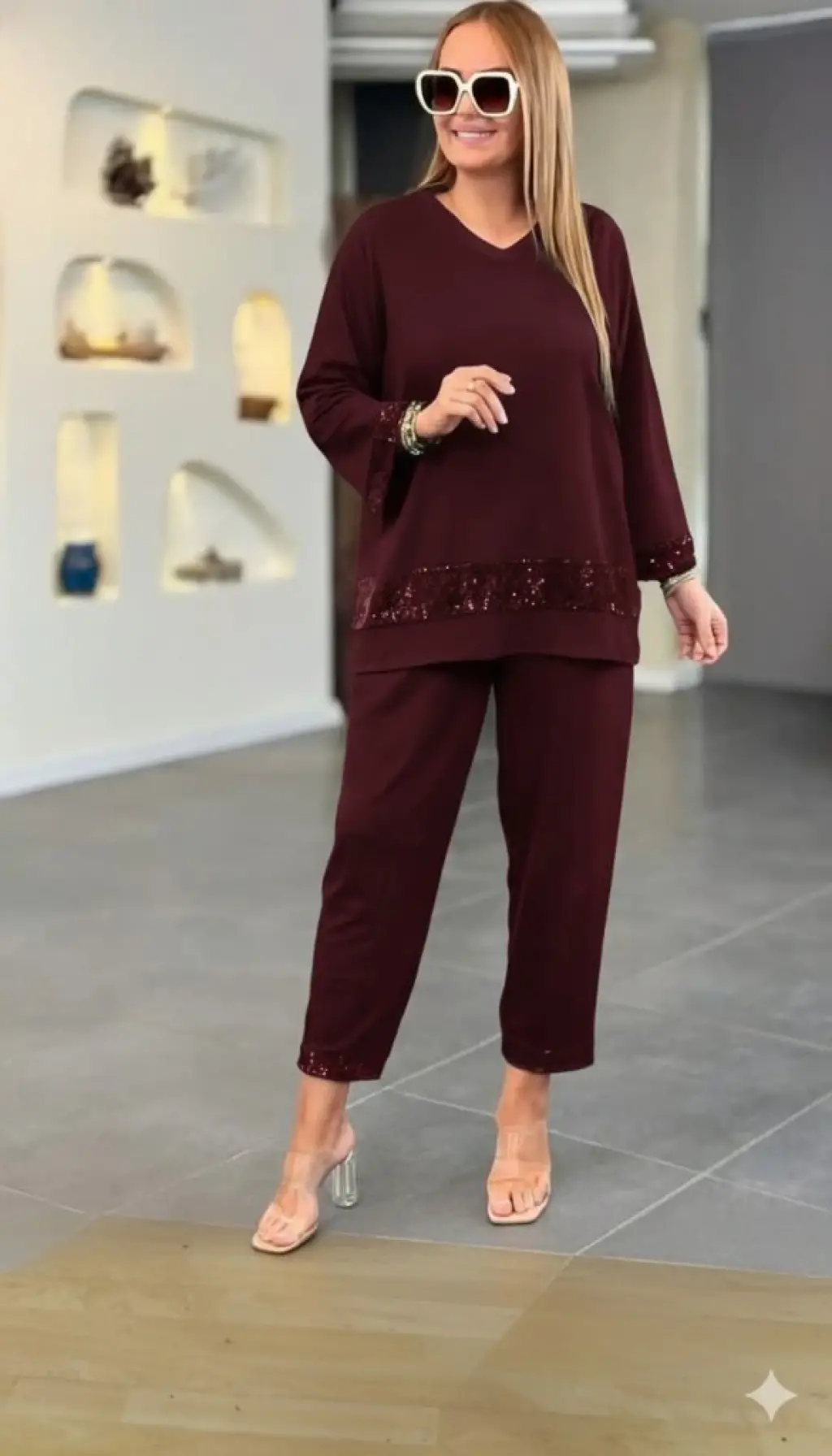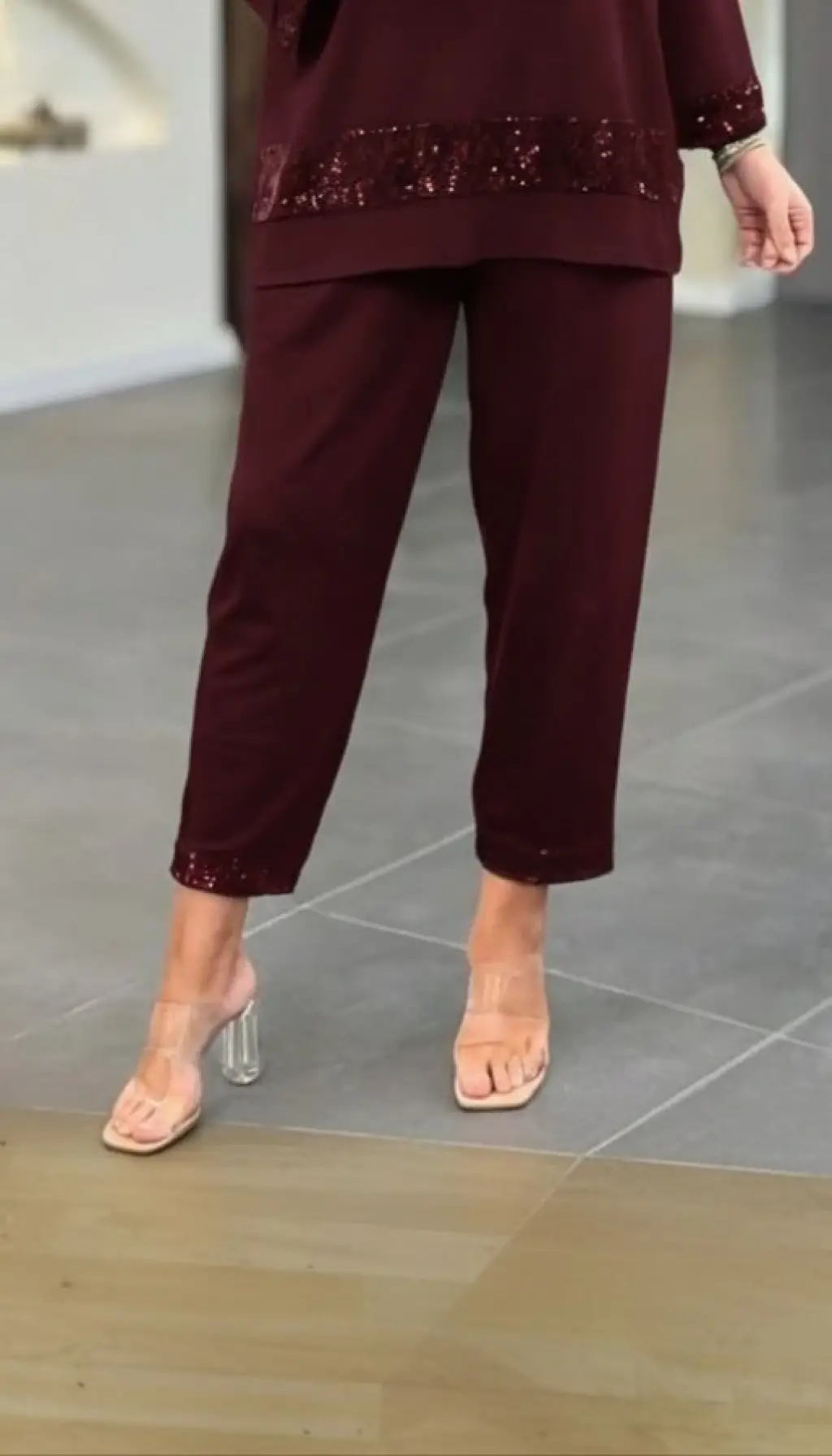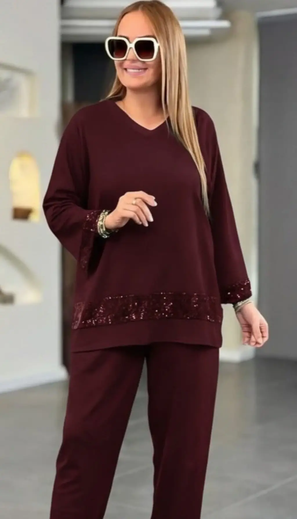 Kadın Uzun Kollu V Yakalı Pulpayet Viskon Iki Iplik Bluz Ve Pantolon Takım