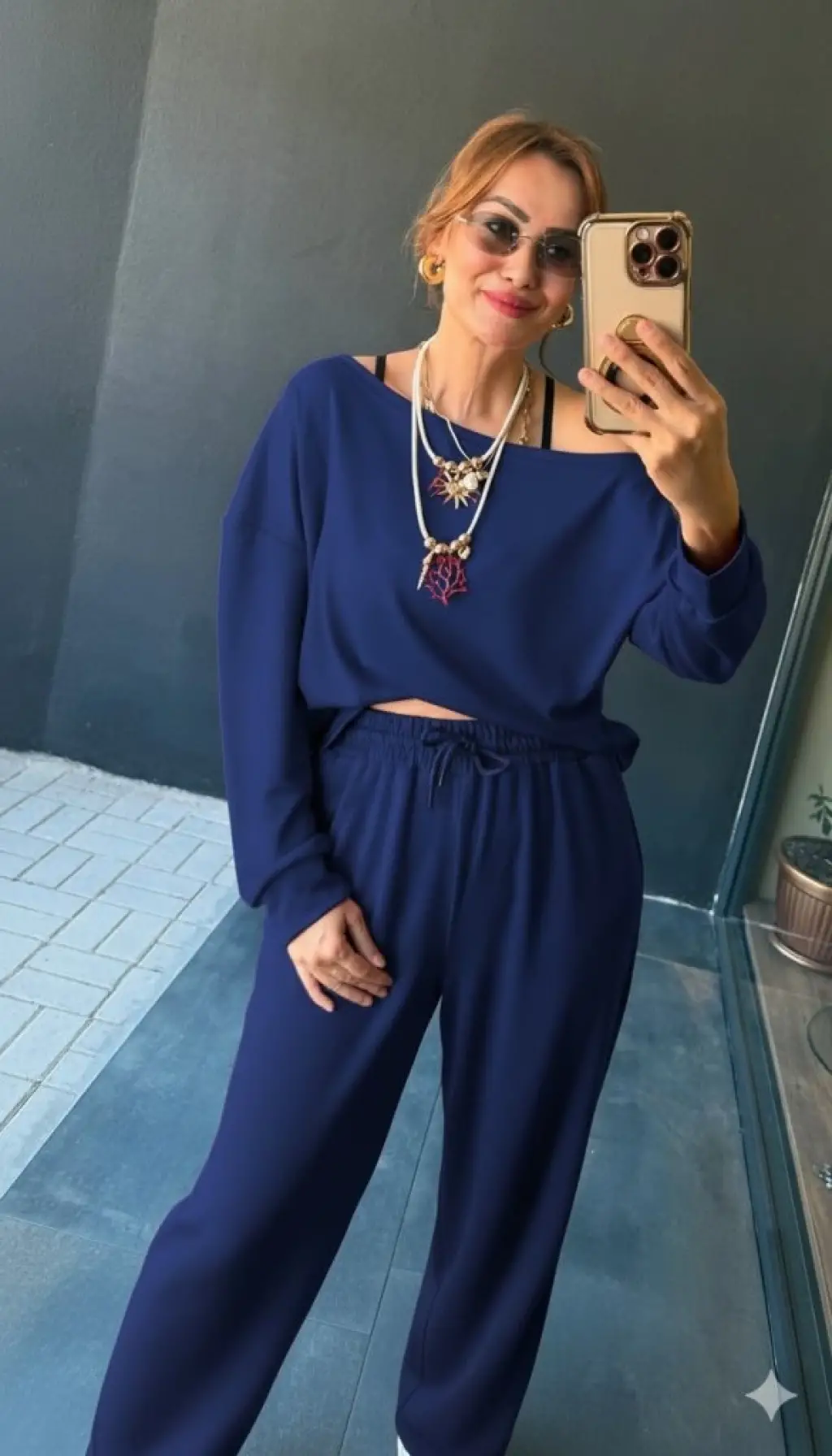 Kadın Uzun Kollu Tek Omuzdan Açık Viskon Iki Iplik Bluz Ve Pantolon Ikili Takım