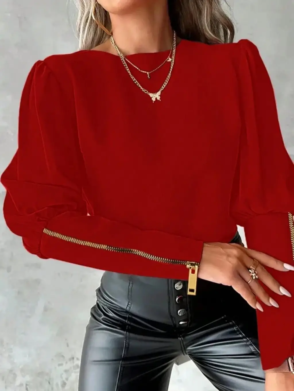 Kadın Uzun Kollu Bisiklet Yaka Fermuar Detaylı Ithal Krep Bluz
