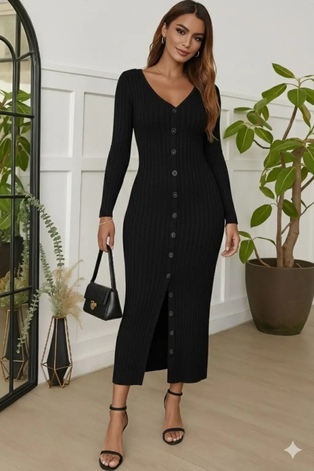 Kadın Uzun Kollu V Yakalı önden Düğmeli Kısa Triko Elbise