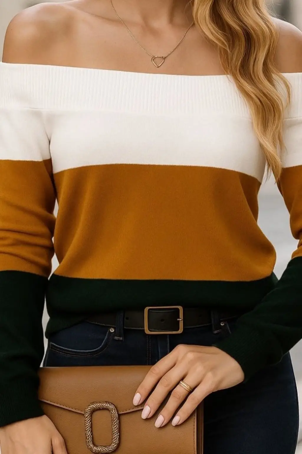 Kadın Uzun Kollu Omuzlardan Açık Uzun Kollu Blok çizgili Triko Bluz